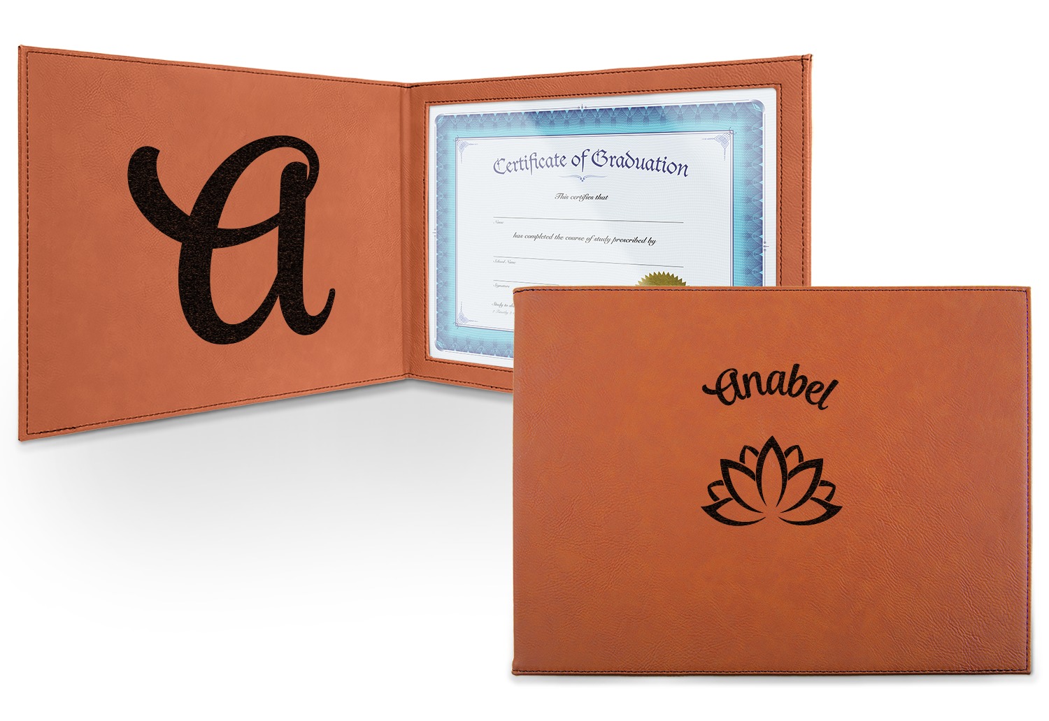 This cognac-colored, leatherette certificate jacket is the ideal way to display or store your hard-earned certificate. When closed, the custom certificate holder measures at 12 by 9 inches. The interior of the certificate cover includes a clear, vinyl window to encase your diploma. The window measures at around 10.5 by 7.5 inches and can accommodate a diploma that measures at up to 8.5 by 11 inches. You can either choose to have your customization laser engraved on the front and interior, or solely the front.