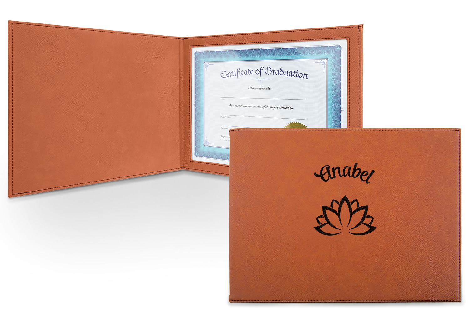 This cognac-colored, leatherette certificate jacket is the ideal way to display or store your hard-earned certificate. When closed, the custom certificate holder measures at 12 by 9 inches. The interior of the certificate cover includes a clear, vinyl window to encase your diploma. The window measures at around 10.5 by 7.5 inches and can accommodate a diploma that measures at up to 8.5 by 11 inches. You can either choose to have your customization laser engraved on the front and interior, or solely the front.