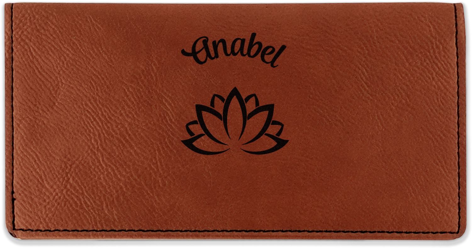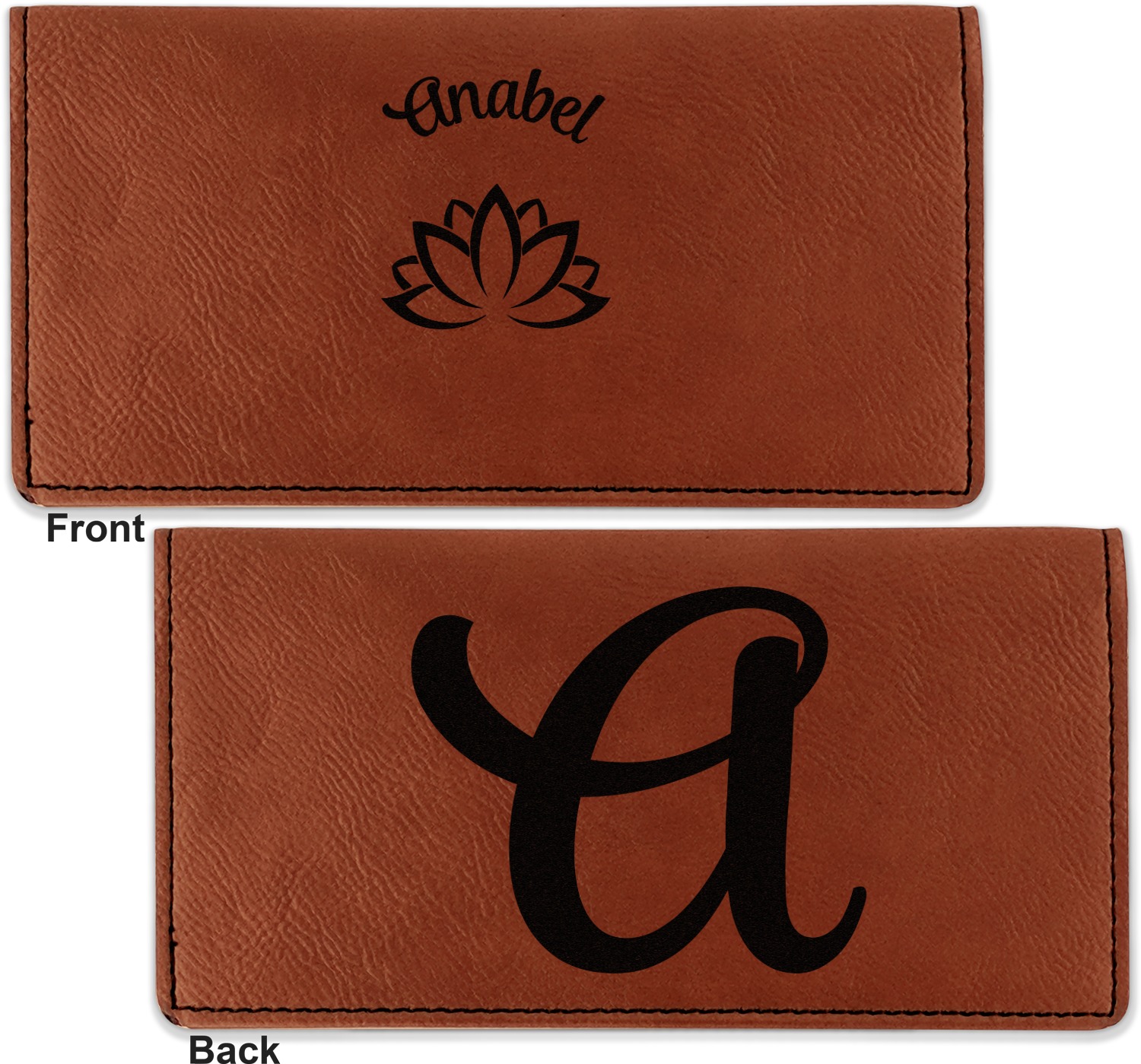 Go into our design center to start personalizing. Your checkbook cover will be laser engraved, making the graphic or text a black color. Choose a fun saying, monogram, or font to go on your checkbook cover. You have the opportunity to do it double or single sided.