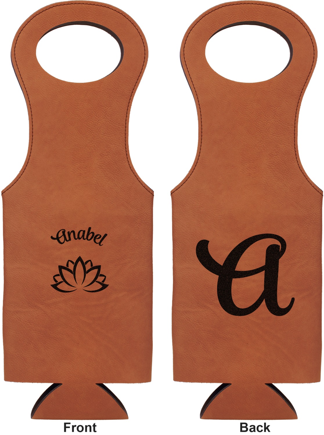 This wine carrier is made from a stunning leatherette, in a cognac-brown color. Strong, black stitching lines the sides of your wine bottle bag and provides extra durability. The interior is lined with a padded, black material to allow for a snug fit once your bottle is placed inside. At the top of this wine gift bag, you'll find two oval shaped handles that elegantly complements the rest of the bag's style. We provide you with the option of laser-engraving the front, or the front and back of your new personalized wine bag!
