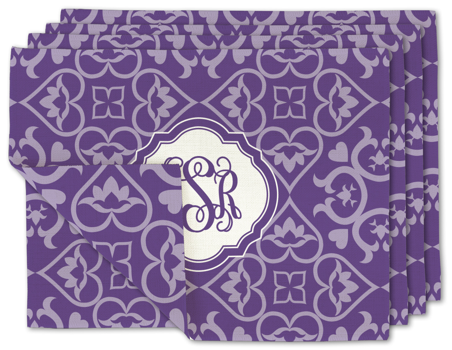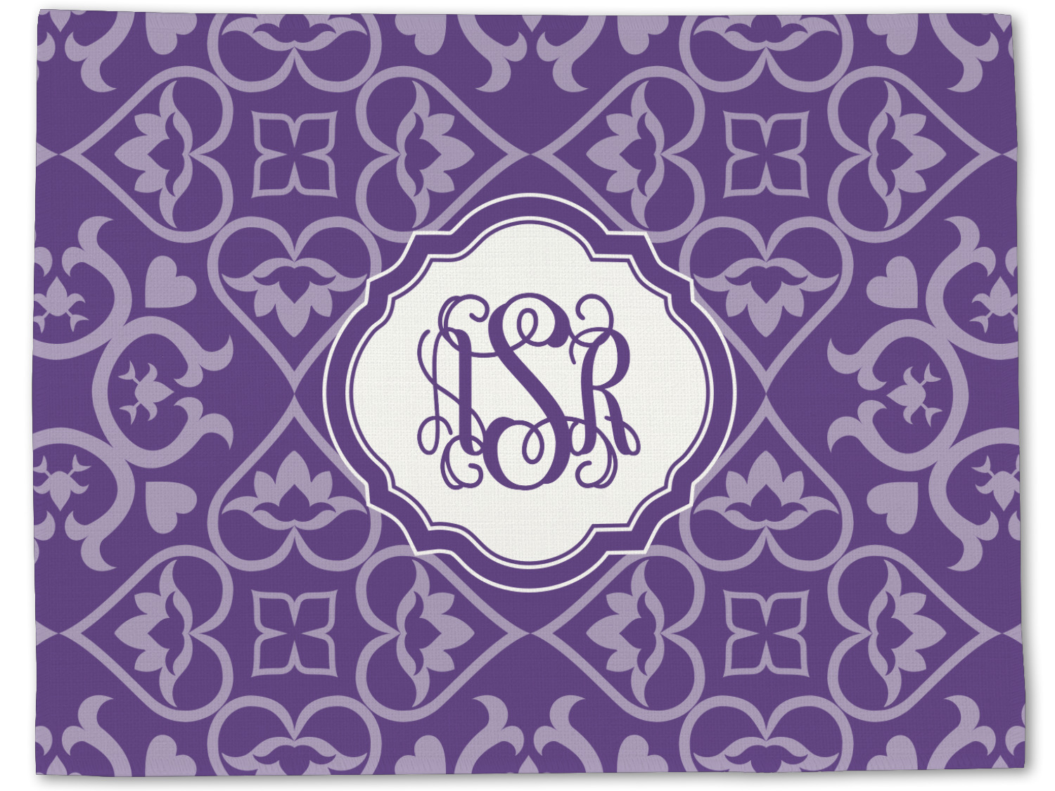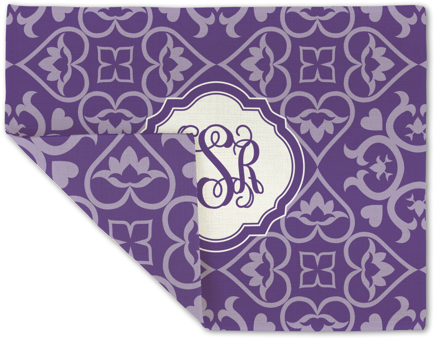 A purple scalloped label highlights a classic personalized monogram or the personalization of your choice.