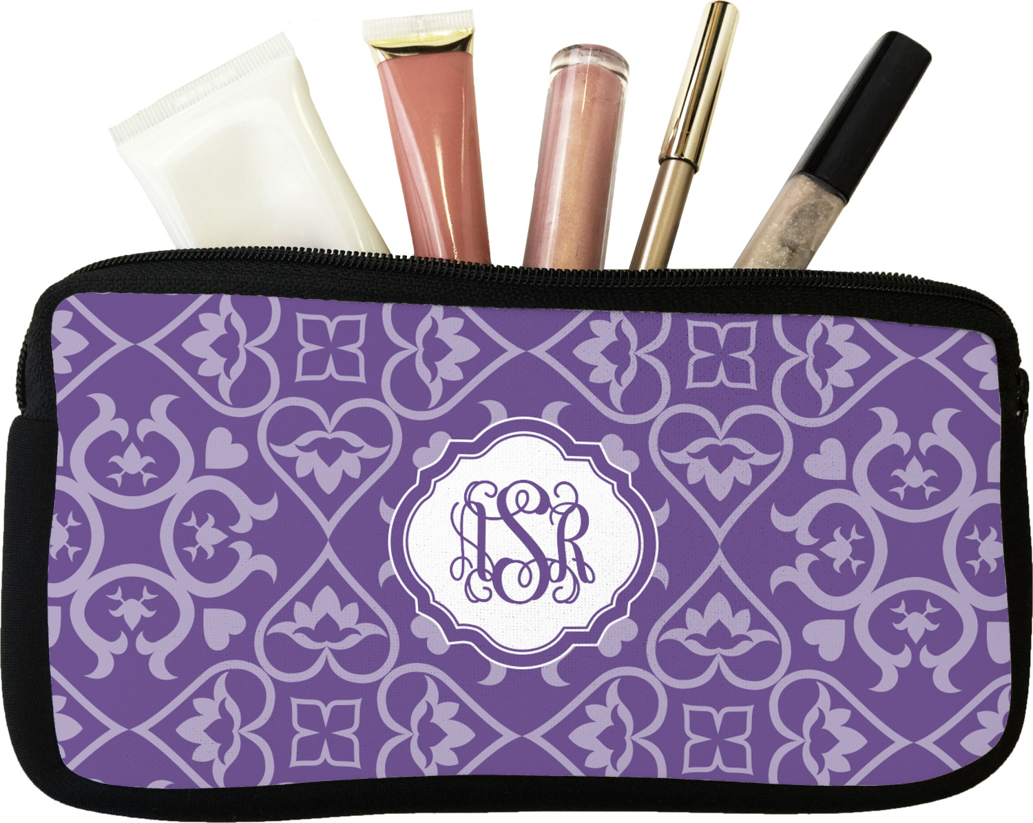 Our personalized makeup bags are available in many different designs, patterns and colors - so you are sure to find one that will love. They are made of neoprene (same material as wet-suits) and thus are water resistant, so spillages in your makeup bag will not end up all over you purse. They are customized on one side and are black on the other side and the zipper is black as well.