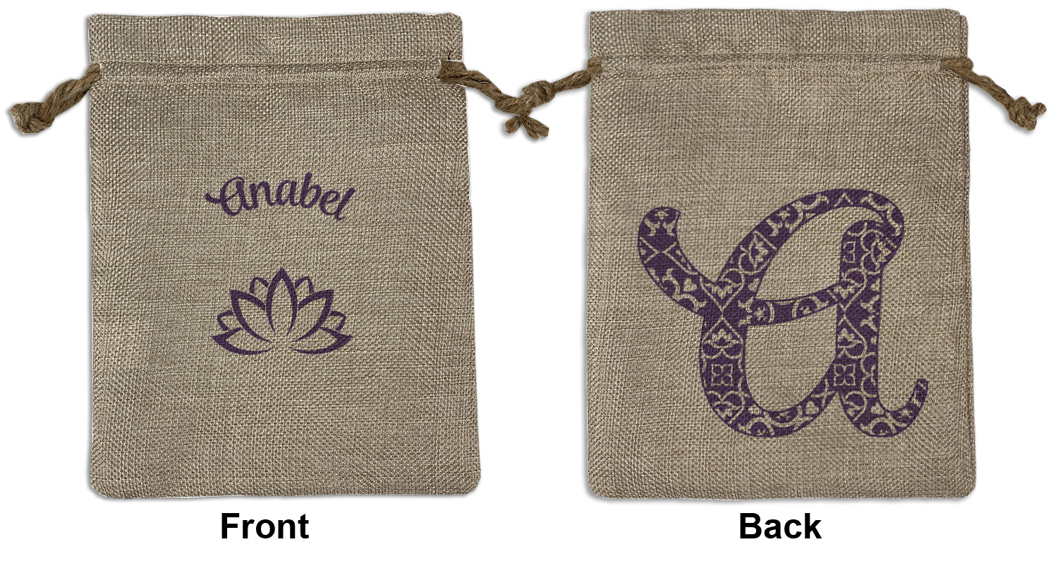 We sell our Burlap Gift Bags in 3 variant sized bags. Made with burlap polyester, each personalized bag can be secured with a twine drawstring pull. Your custom design is available to print on one side or both sides - completely up to you! The sizes of the bags measure approximately 4.5" x 6.5" for the smallest size, 6.5" x 8.0" for the medium size, and 6.5" x 13.5" for the large-sized bag.