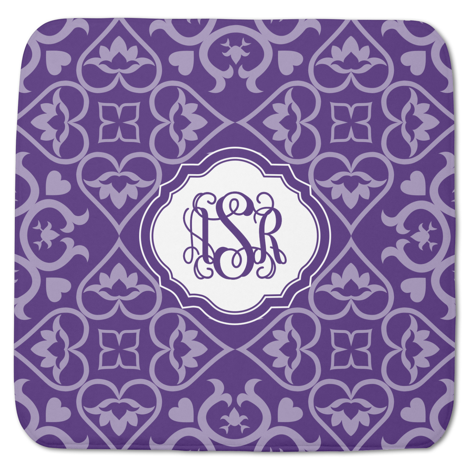 A purple scalloped label highlights a classic personalized monogram or the personalization of your choice.