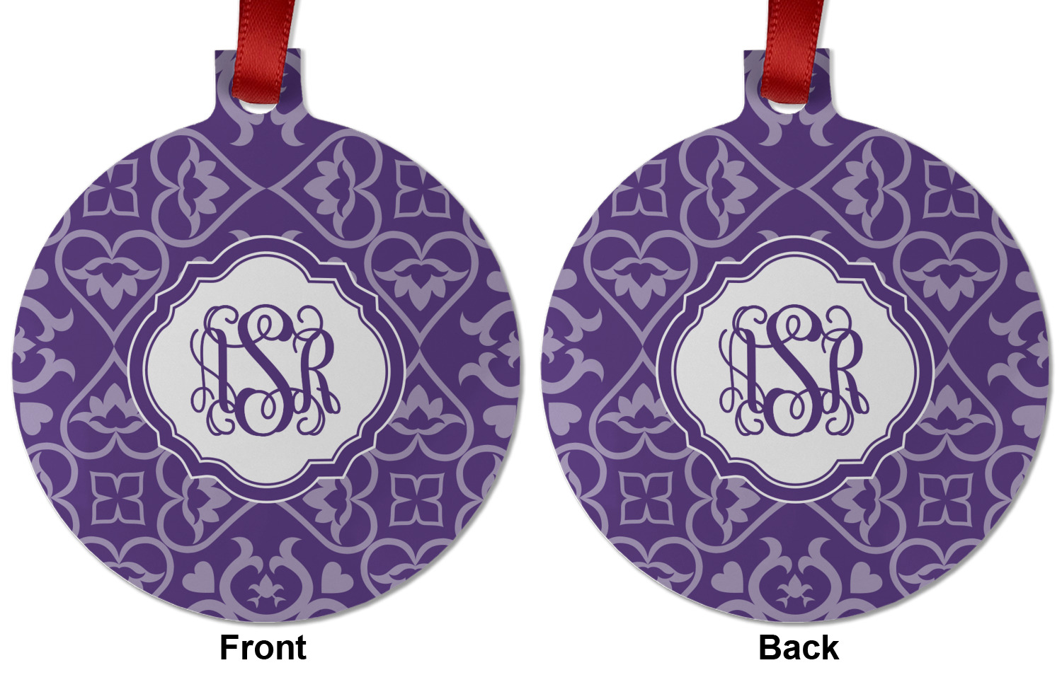 A purple scalloped label highlights a classic personalized monogram or the personalization of your choice.
