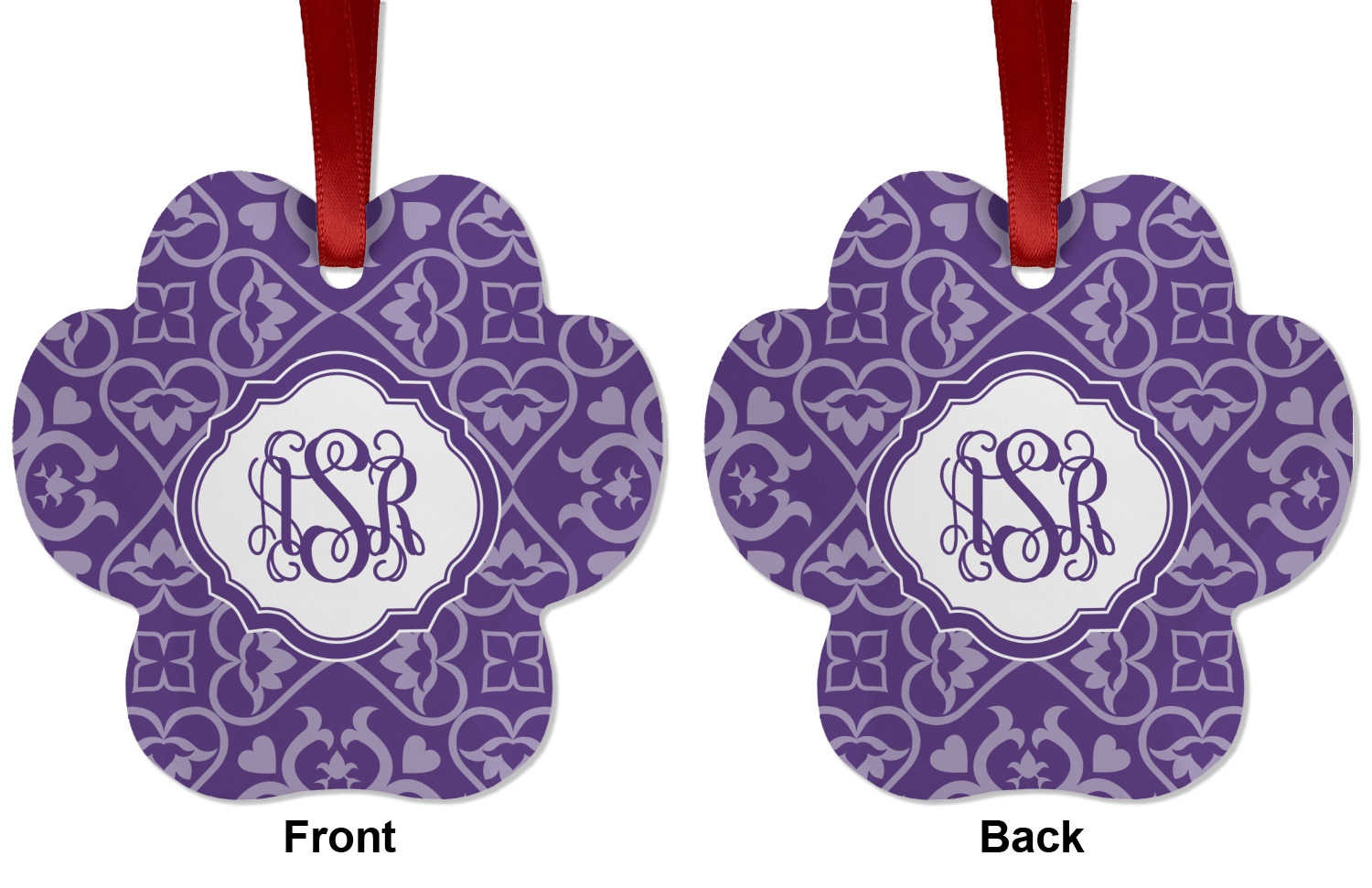 A purple scalloped label highlights a classic personalized monogram or the personalization of your choice.