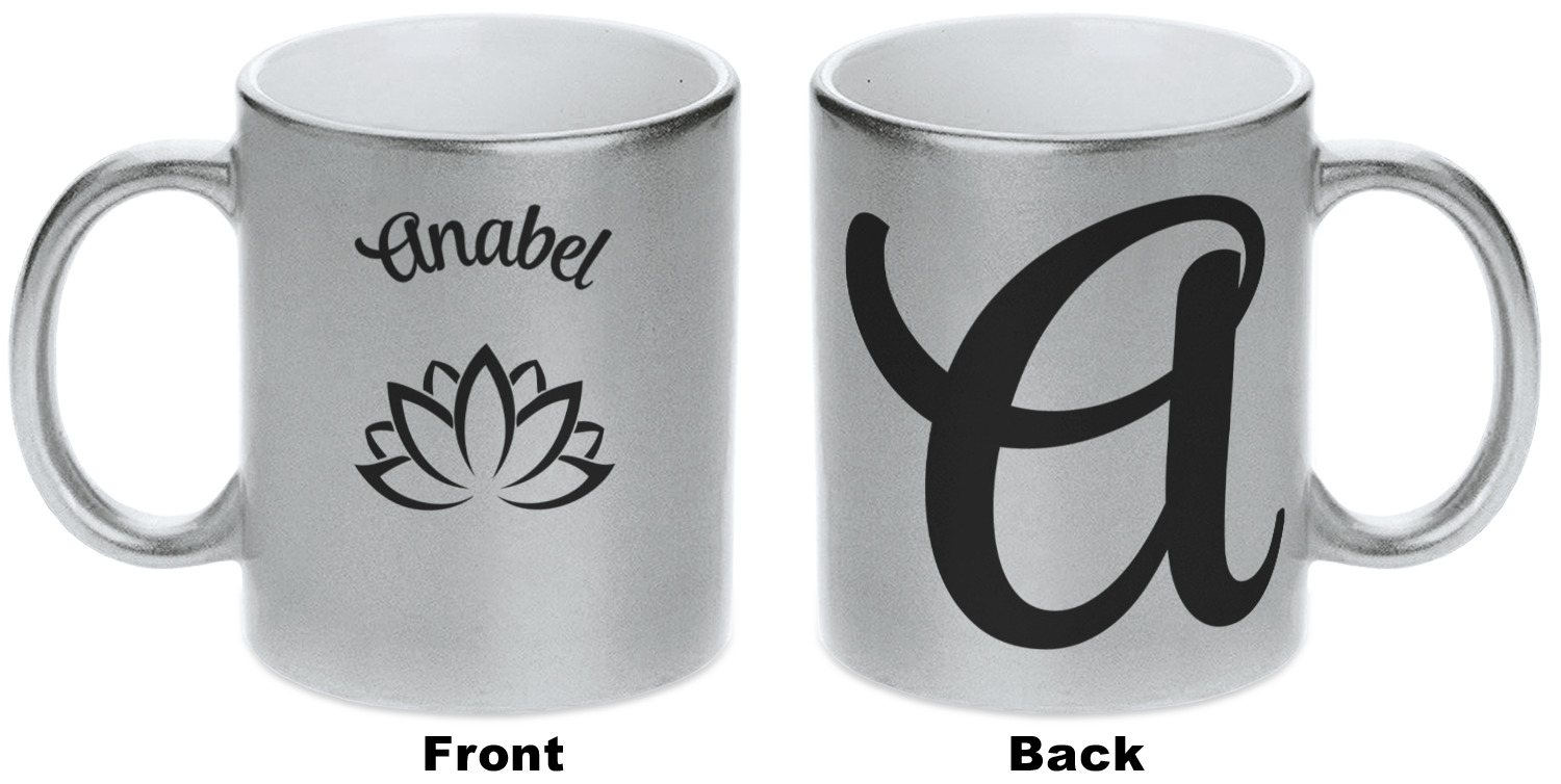 Our custom mugs are ceramic, which is great for keeping your tea or coffee warm! We offer two metallic mugs to personalize - Silver or Gold. Both styles hold around 11oz and have dimensions of approximately 3.75" x 3.5" x 4.75". Both the metallic mugs come in a matte finish and have glitter detailing to add a more pristine feel to the gold and silver base colors.
