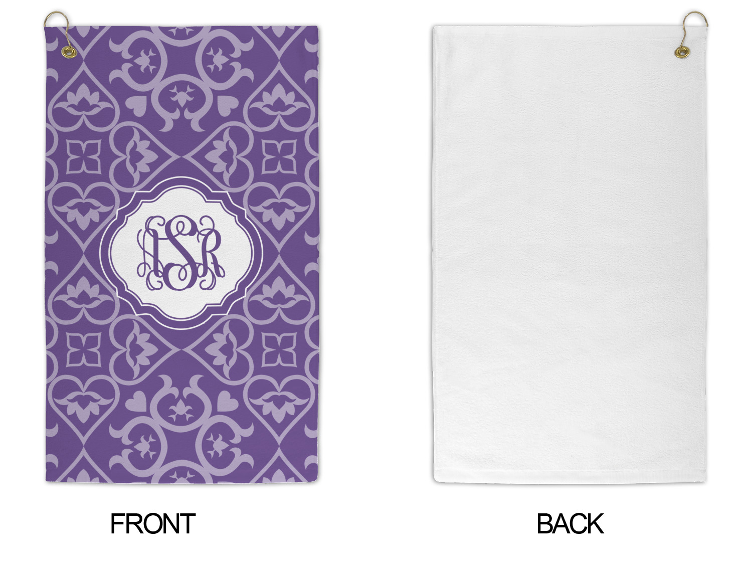 A purple scalloped label highlights a classic personalized monogram or the personalization of your choice.