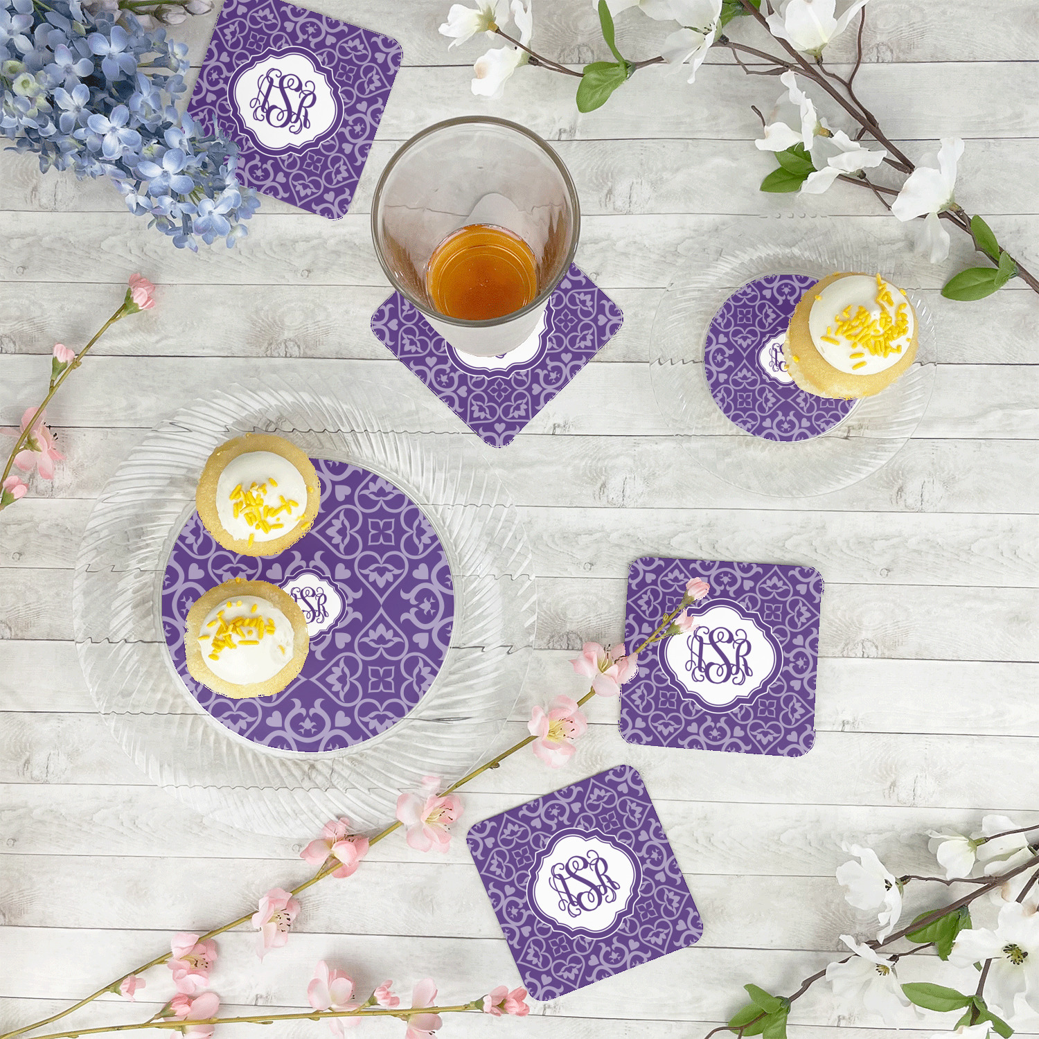 A purple scalloped label highlights a classic personalized monogram or the personalization of your choice.