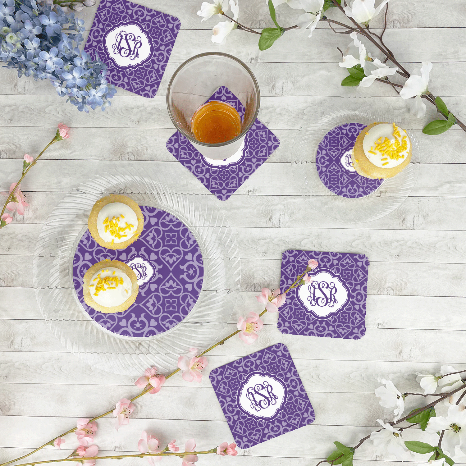 A purple scalloped label highlights a classic personalized monogram or the personalization of your choice.