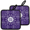 Our personalized pot holders feature a neoprene front that displays your personalization in vibrant colors. The backing of the hot pot holder is rubberized; the textured backing allows you to have a great grip when using this custom pot holder. The two materials are joined with a sleek, black trim, and the holder also includes an attached loop for hanging and storage. The pot holder is approximately 8.75 inches by 8.75 inches and 0.25 inches tall, while the fabric loop is 2.5 inches long. You can purchase a kitchen pot holder by itself or as a set of 2. We also offer a set including one pot holder and one oven mitt.