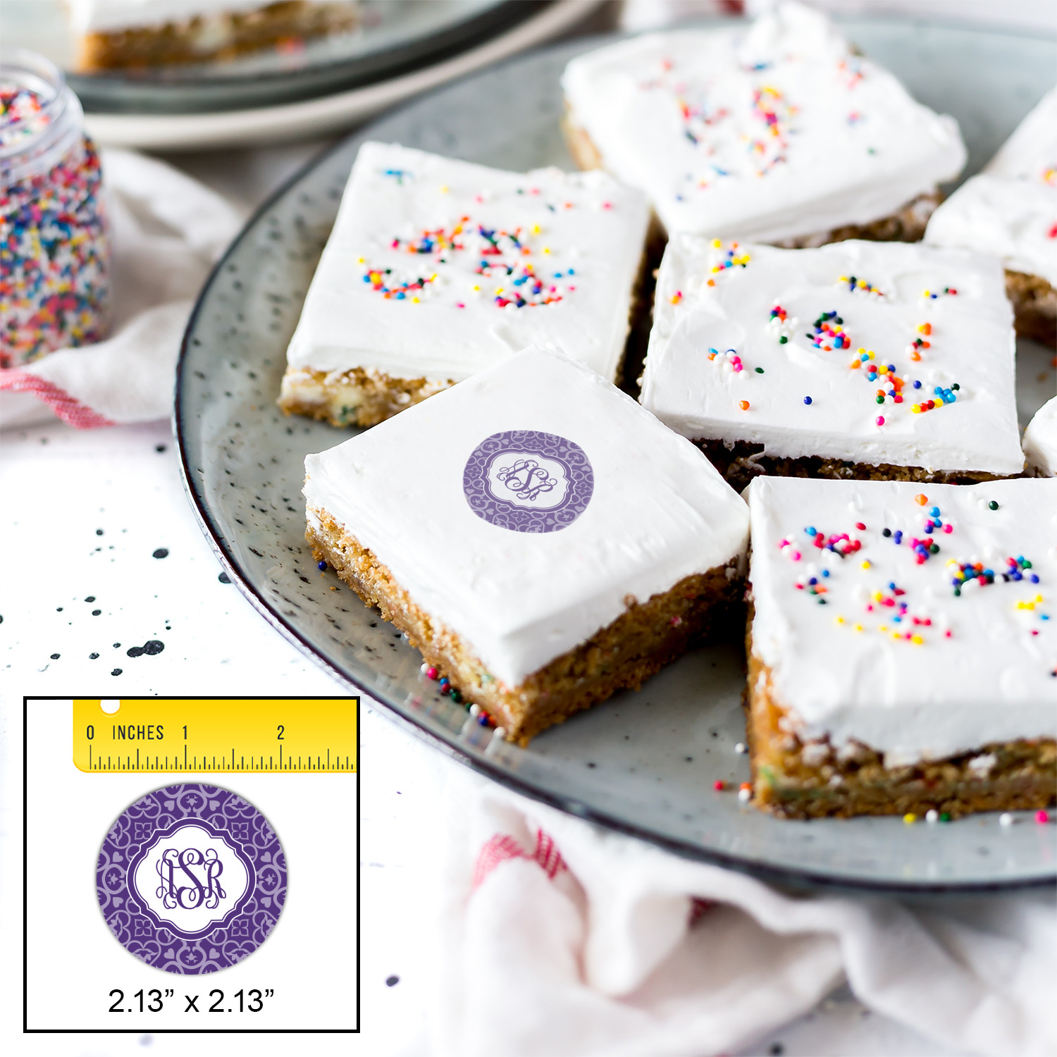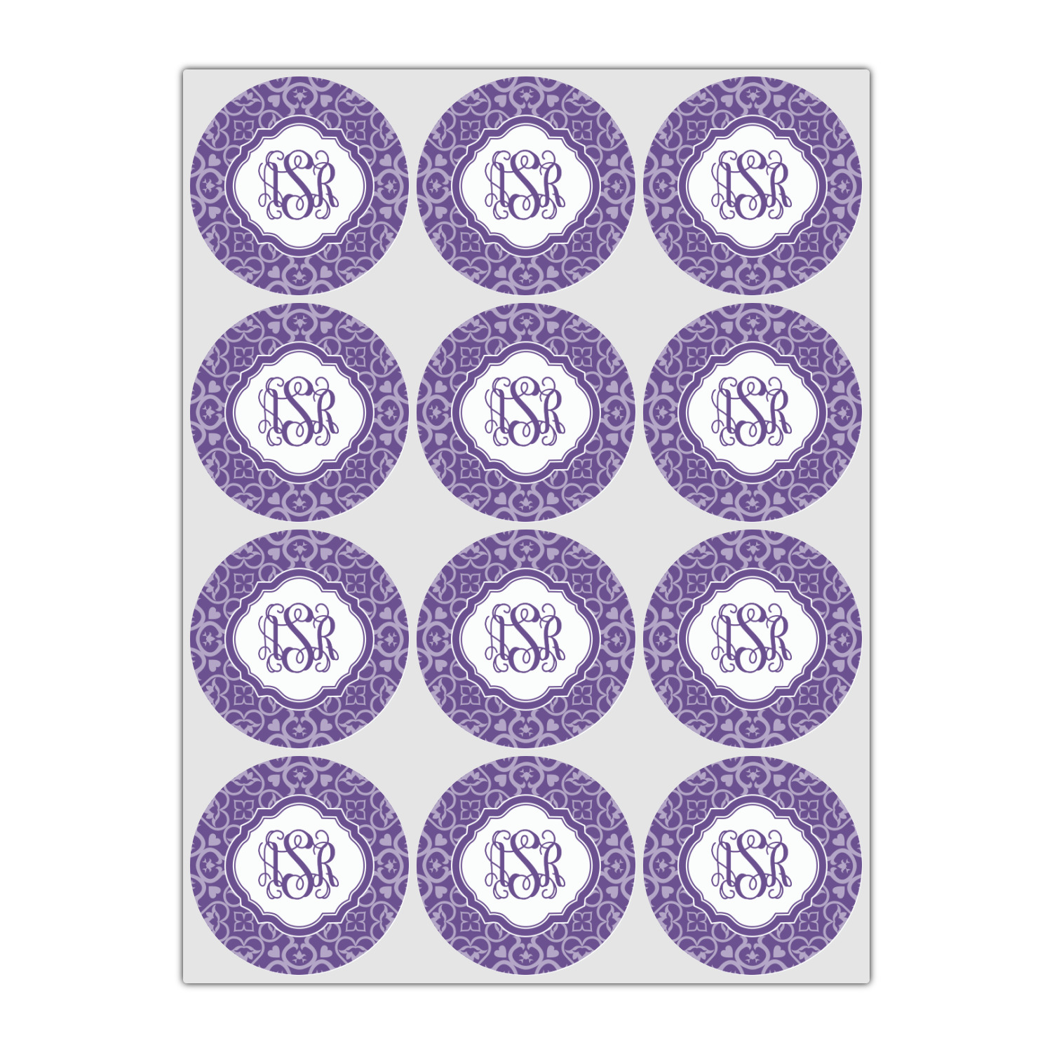 A purple scalloped label highlights a classic personalized monogram or the personalization of your choice.