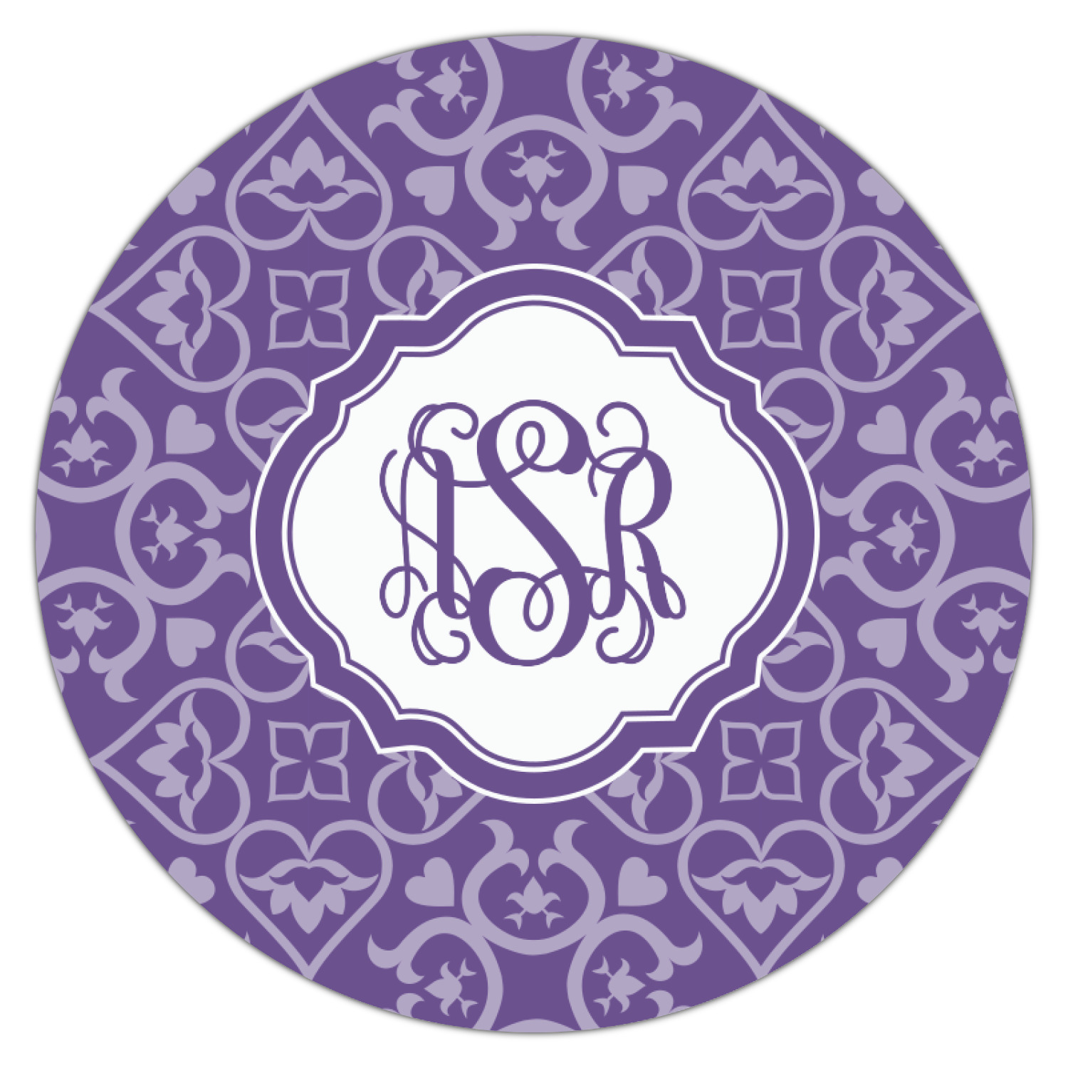 A purple scalloped label highlights a classic personalized monogram or the personalization of your choice.