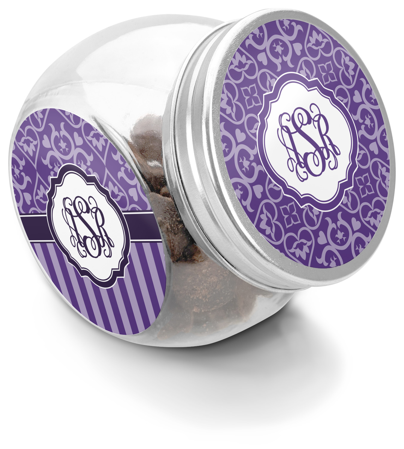 A purple scalloped label highlights a classic personalized monogram or the personalization of your choice.