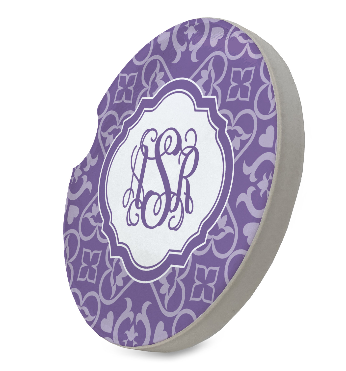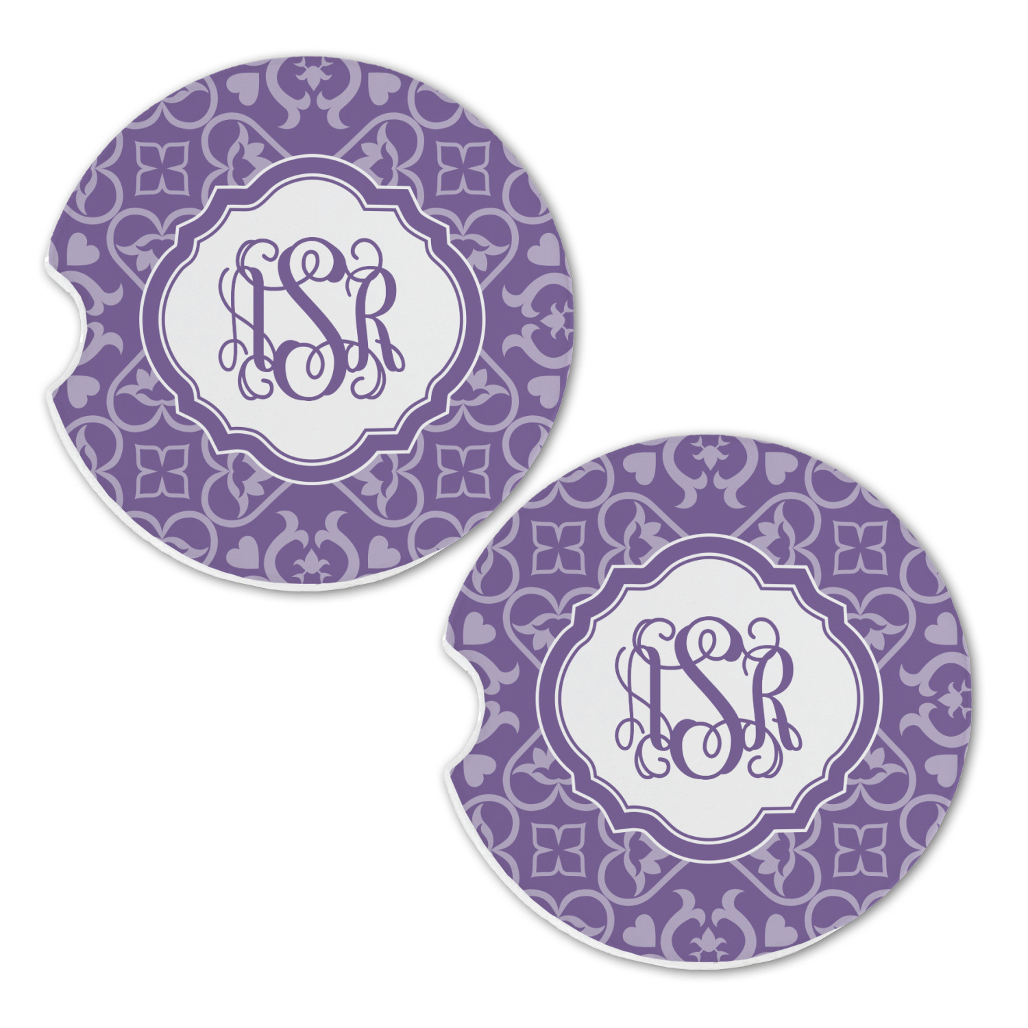A purple scalloped label highlights a classic personalized monogram or the personalization of your choice.