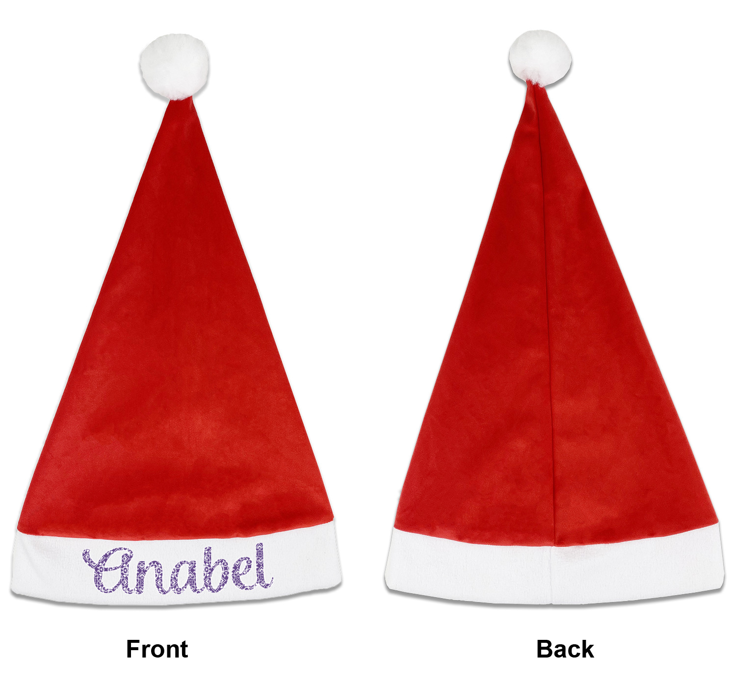 Our Santa hats are a soft, velvety polyester material. These customizable Santa hats are a classic red with white brimming and pom pom ball hanging off the hat tail just like Santa Claus! Each personalized Santa hat is approximately 17.5 L x 11.8 W. We offer two different styles to print your designs on the white brim - front or front & back.