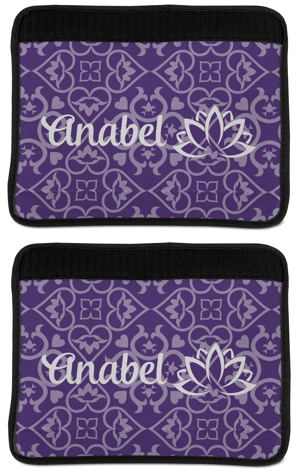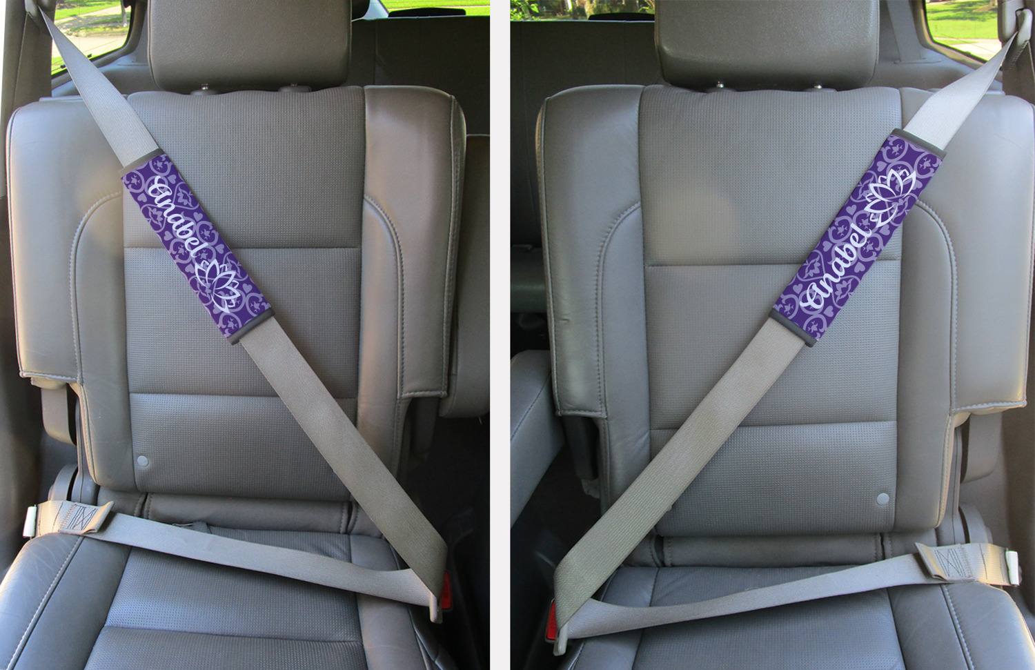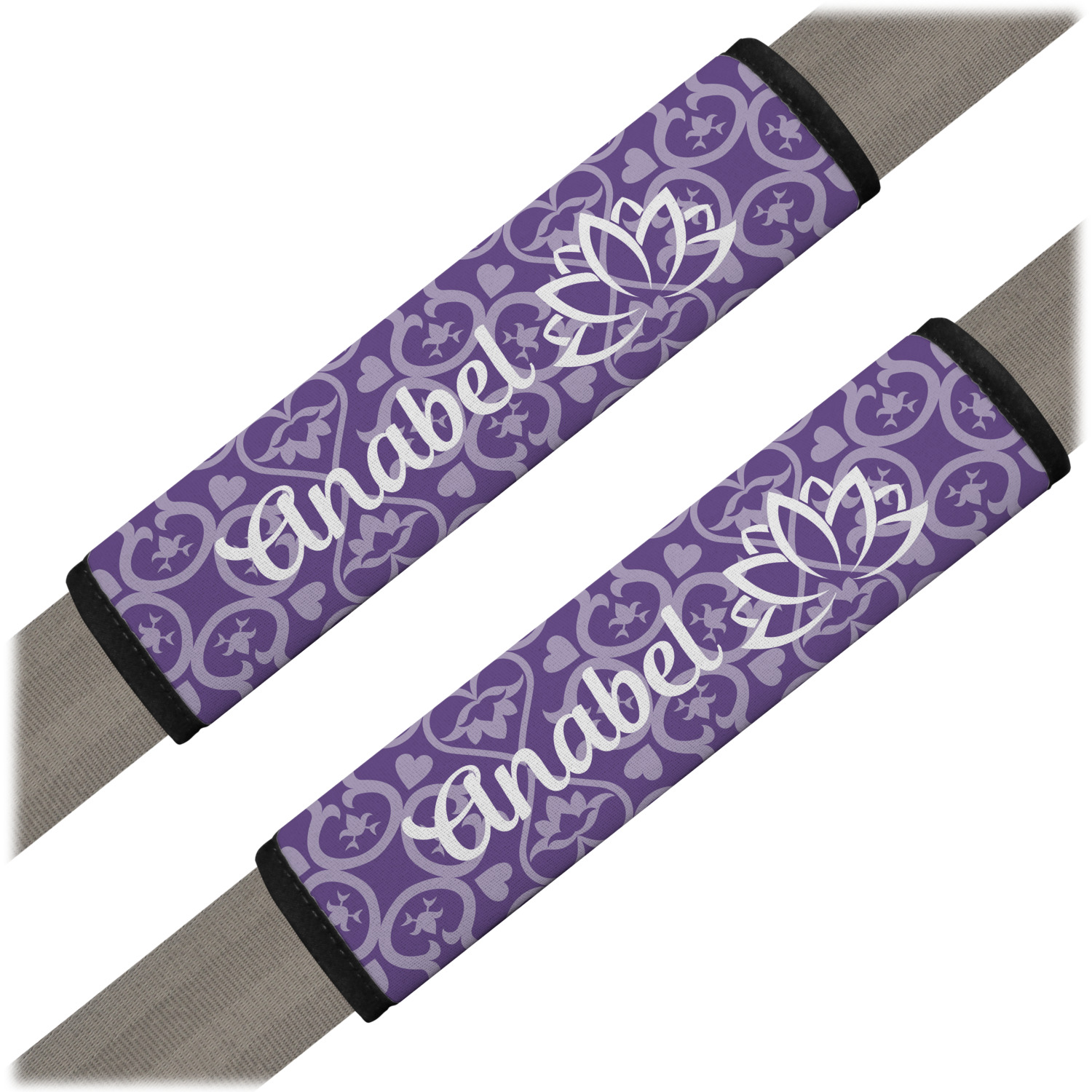 Made from neoprene, our seat belt strap covers wrap around the belt itself and have a Velcro tab for easy attachment and closure. The belt's edges are trimmed with a black polyester for a secure finish. Each cover is 9.5 by 7 inches when open and 9.5 by 2.5 inches when closed. We print your personalized design on the face of the seat belt pad.