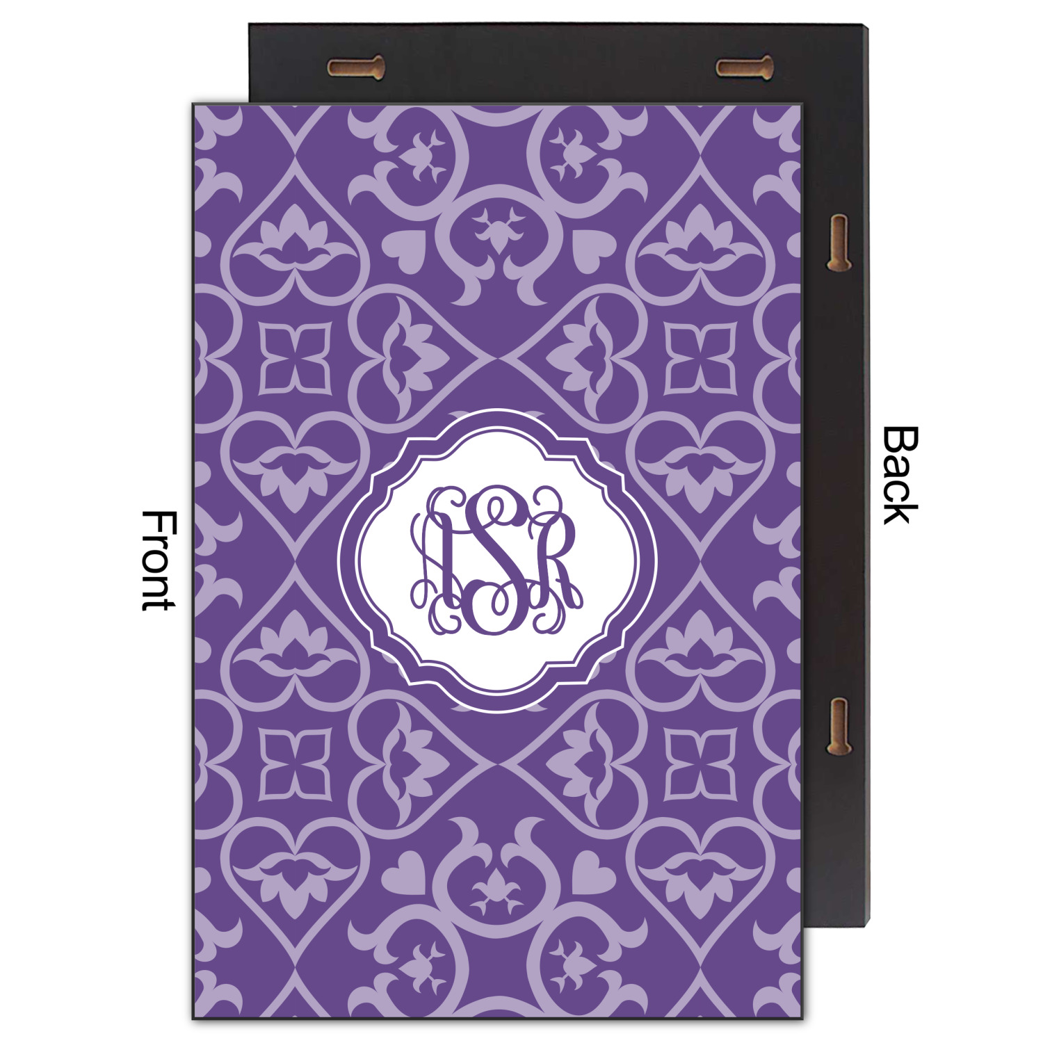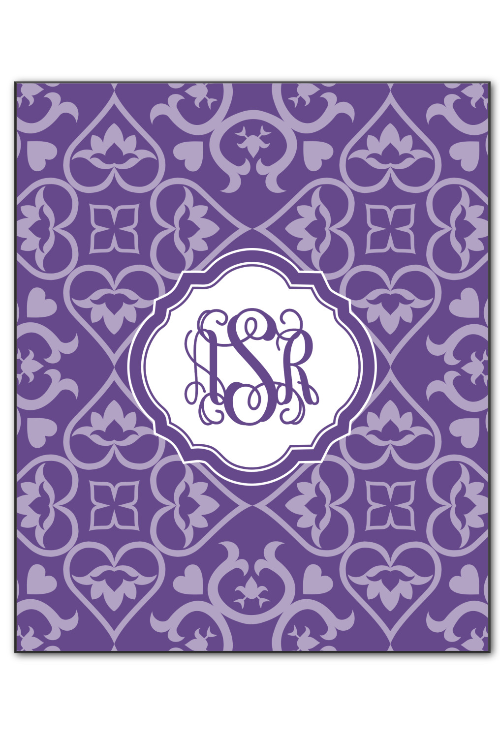 A purple scalloped label highlights a classic personalized monogram or the personalization of your choice.