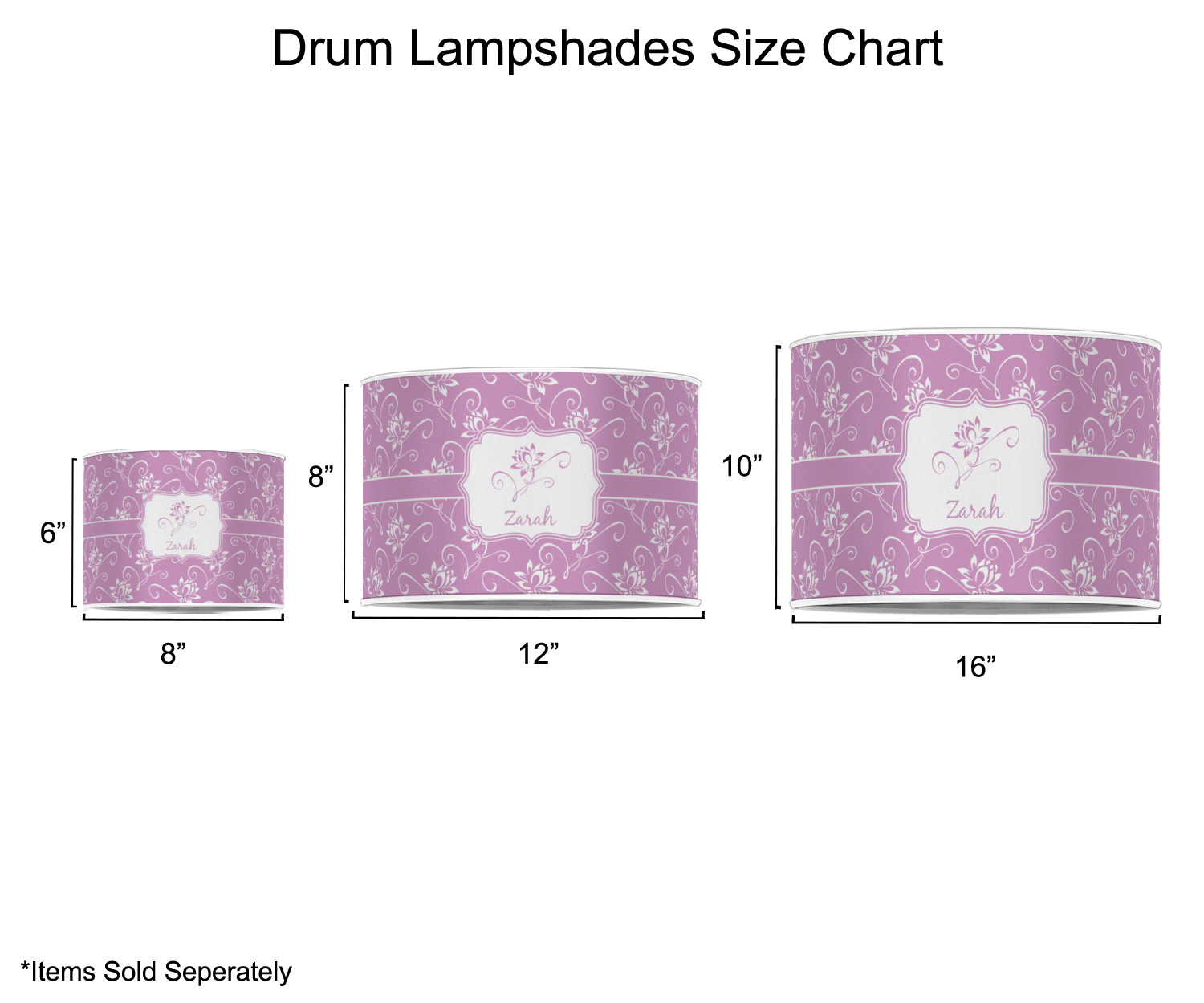 Our customized lamp shades also come in 3 different sizes: 8", 12" and 16", measuring at 8" in diameter by 6" tall, 12" in diameter by 8" tall, and 16" in diameter by 10" tall, respectively.