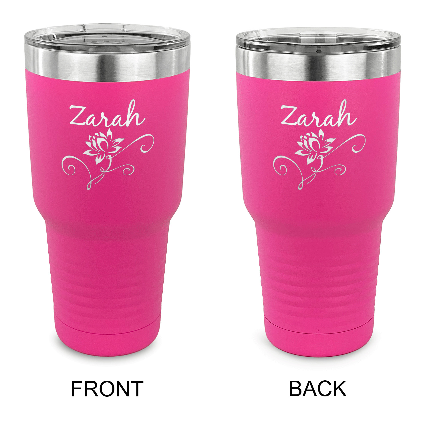 With the 5 colors - Black, Navy, Red, Pink and Coral, you are sure to find a cup to fit your personality. You can chose to engrave on the front or the front and back of the cup. Use our design studio to design your own cup and we laser engrave it for you.