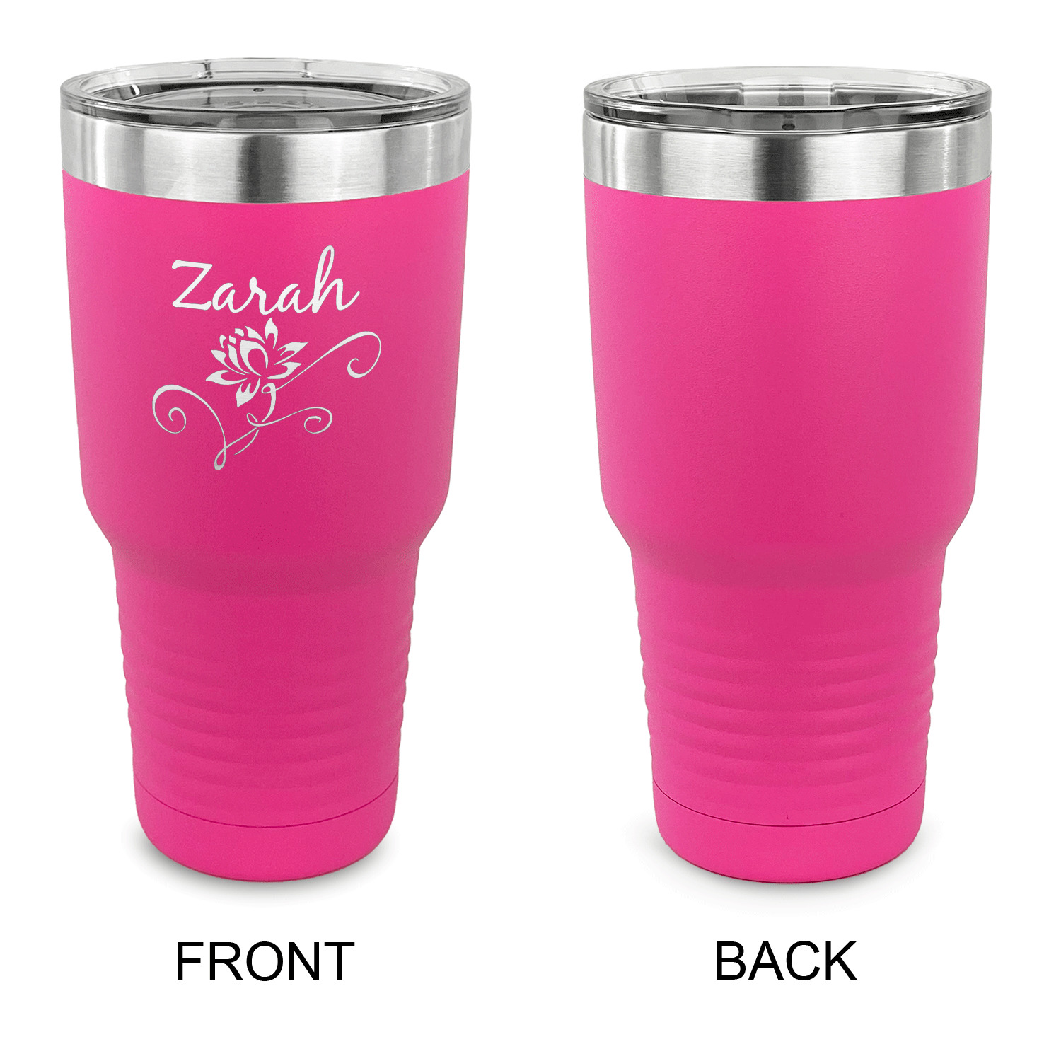 With the 5 colors - Black, Navy, Red, Pink and Coral, you are sure to find a cup to fit your personality. You can chose to engrave on the front or the front and back of the cup. Use our design studio to design your own cup and we laser engrave it for you.