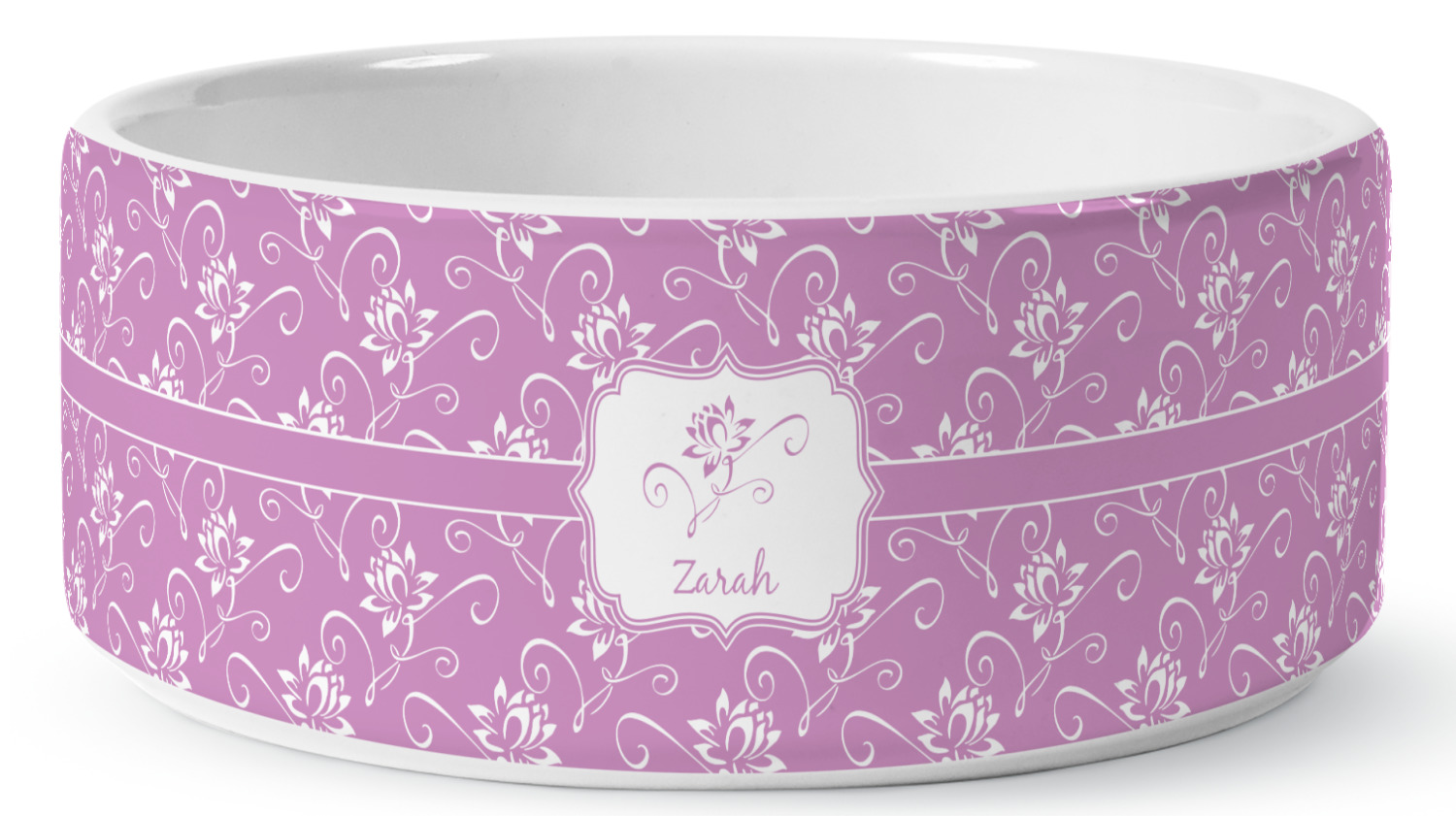 We carry these custom dog bowls in two available sizes: medium and large.The medium is 6 inches in diameter and 2.5 inches tall, and can therefore suit pets who eat up to 2.5 cups of food per meal. The large pet bowl is 7 inches in diameter and 3 inches tall, and suits pets who require up to 4.5 cups of food per meal.