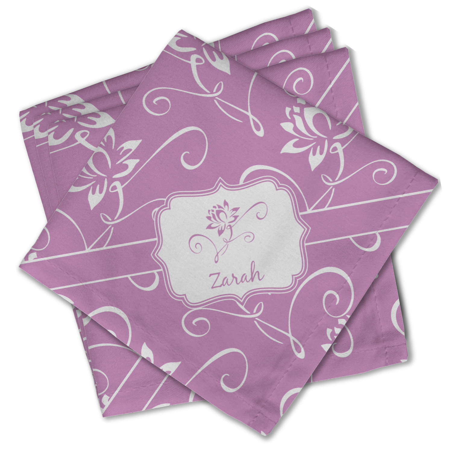 Each customizable cloth napkin is a polyester material guaranteed for long-term use. Since our napkins are cloth, it serves as a great reusable and eco-friendly dining decor. We sell personalized napkins individually or as a set of 4! Print your own unique design on all four napkins, or create four individual designs for each napkin! We offer two different napkin sizes - Cocktail napkins (approx. 10 x 10) and Dinner napkins (approx. 20 x 20). We print your design on one side, perfect for displaying your custom designed lunch napkins in any fold or table setting!