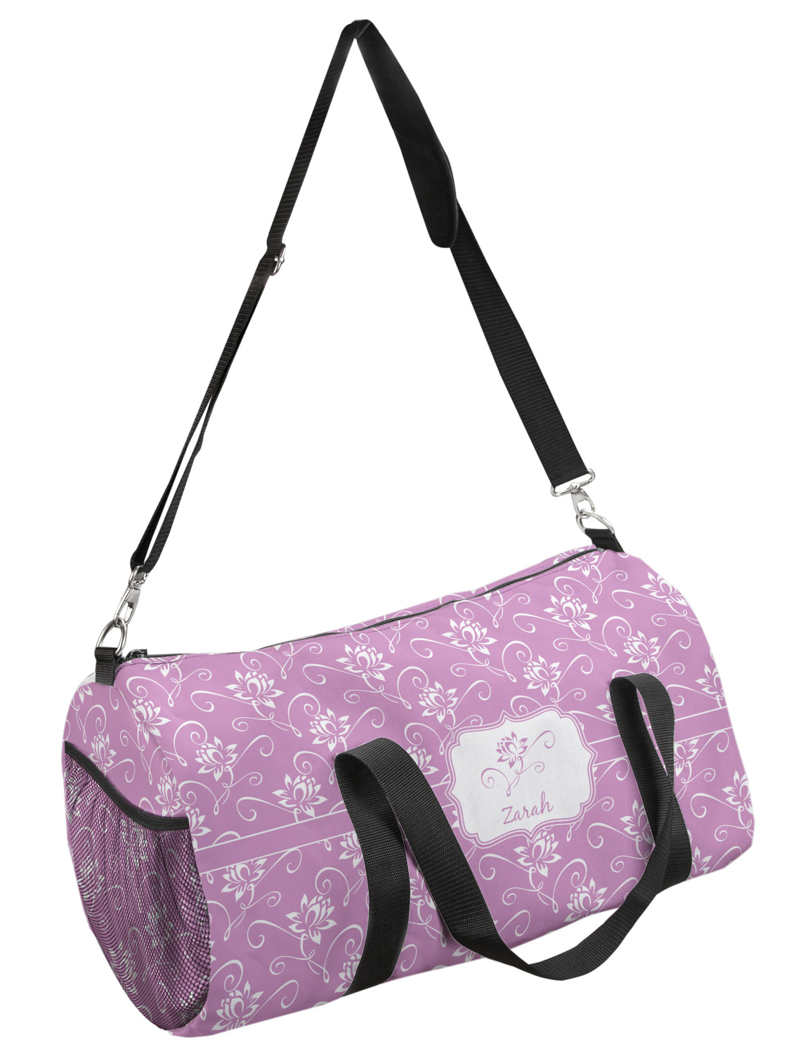 This duffle is a sturdy bag made of a canvas material. It comes in two sizes: Small (19"W x 9.5"H x 9.5"D) and Large (23"W x 12"H x 12"D). The bag is a cylindrical shape with a black adjustable strap and two handles. On one side is an elastic pouch to put a waterbottle or other small item. Your product will be sublimated with your design and is able to be designed on the front, back, and sides. Be sure to remember that the straps may cut into parts of your design if you upload your own artwork.