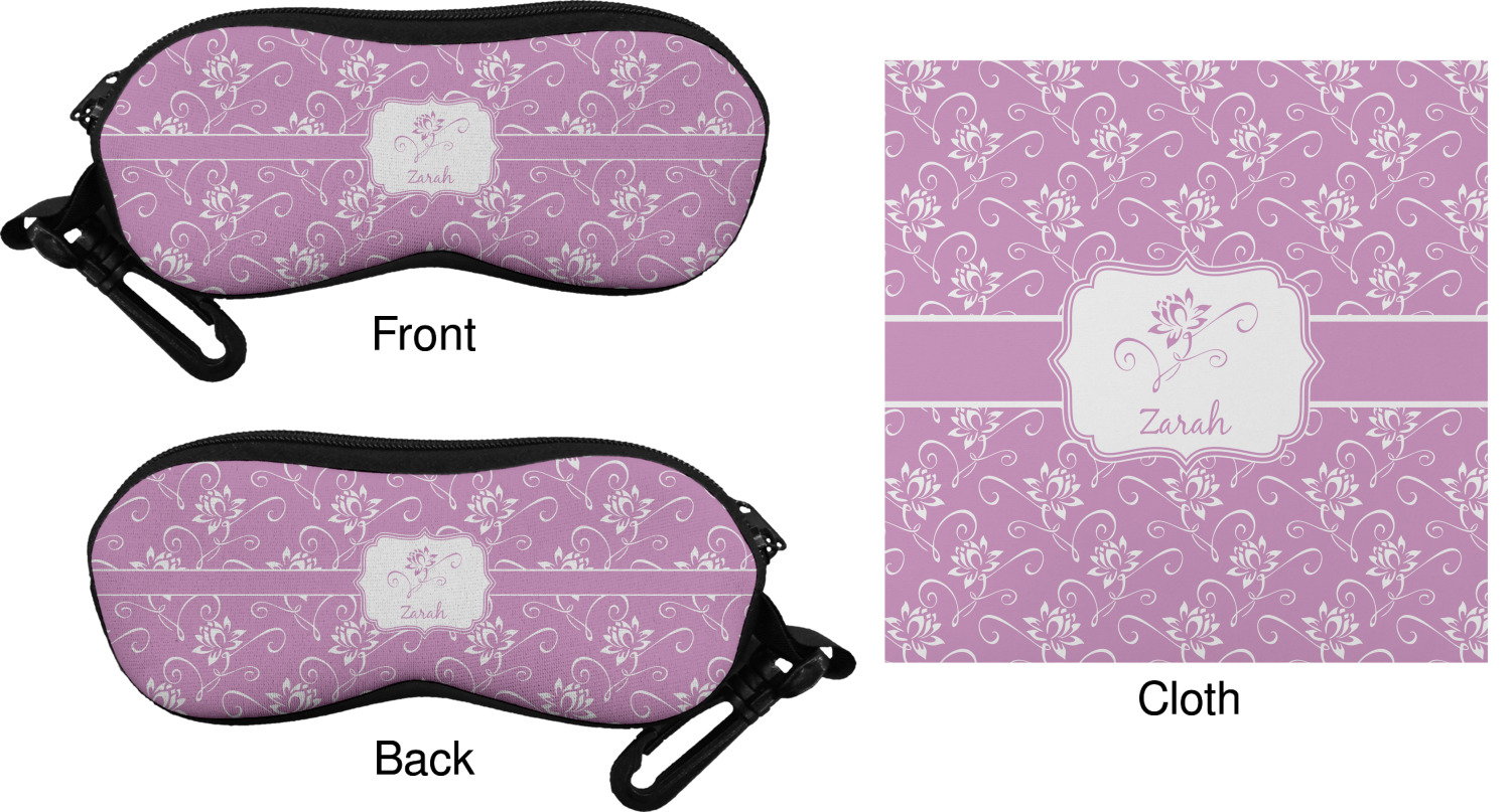 The cases have the design on both sides, a black zipper, and clips for hanging on a belt buckle or purse strap and also include matching lens cloths.