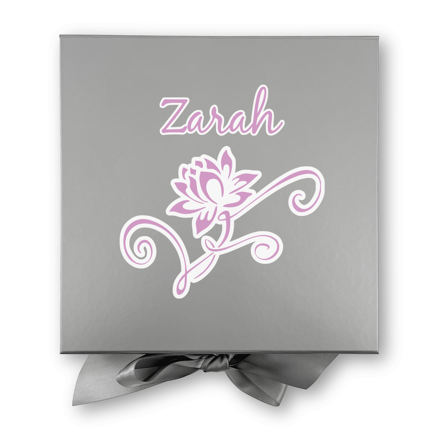 A single lotus flower rests in the center label. Add the personalization of your choice underneath.
