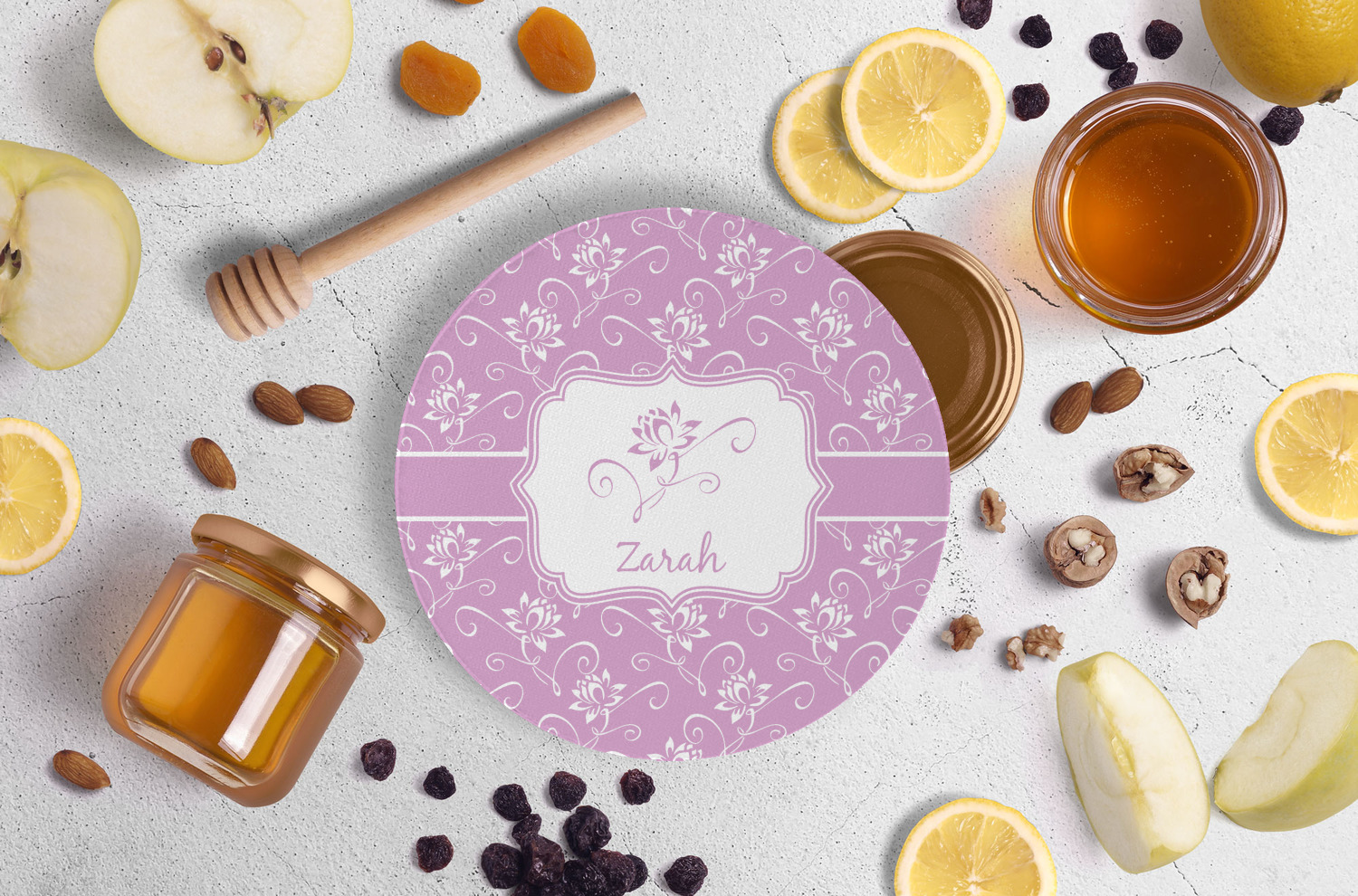 A single lotus flower rests in the center label. Add the personalization of your choice underneath.