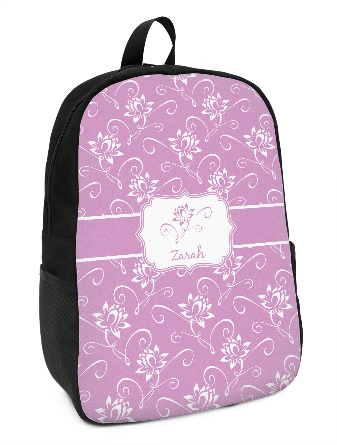 These small backpacks are made of a durable black canvas material with your personalization right on the front. The two shoulder straps are padded and easily adjustable. The bag itself measures at about 11" W x 15" H x 5" D. It's the perfect size for elementary aged kids or adults who want a smaller backpack. On the top of the bag you will find a handle to hang or carry your backpack by as well as a large zipper closure to keep all of your belongings safe inside. On each side of your backpack is a mesh pocket for a small item or water bottle. Inside your backpack you will find a spacious area with a small zipper pocket and a padded laptop slot that will fit up to a 13" laptop (13" being very snug). This is the perfect bag for any student that needs a couple books and their laptop with them at all times. It also works great as a carry on for traveling!