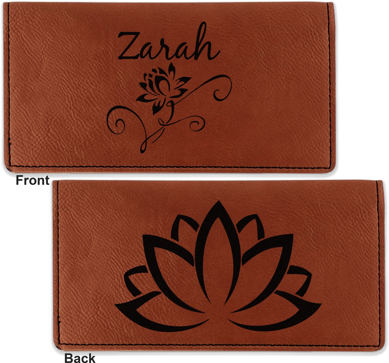 Go into our design center to start personalizing. Your checkbook cover will be laser engraved, making the graphic or text a black color. Choose a fun saying, monogram, or font to go on your checkbook cover. You have the opportunity to do it double or single sided.