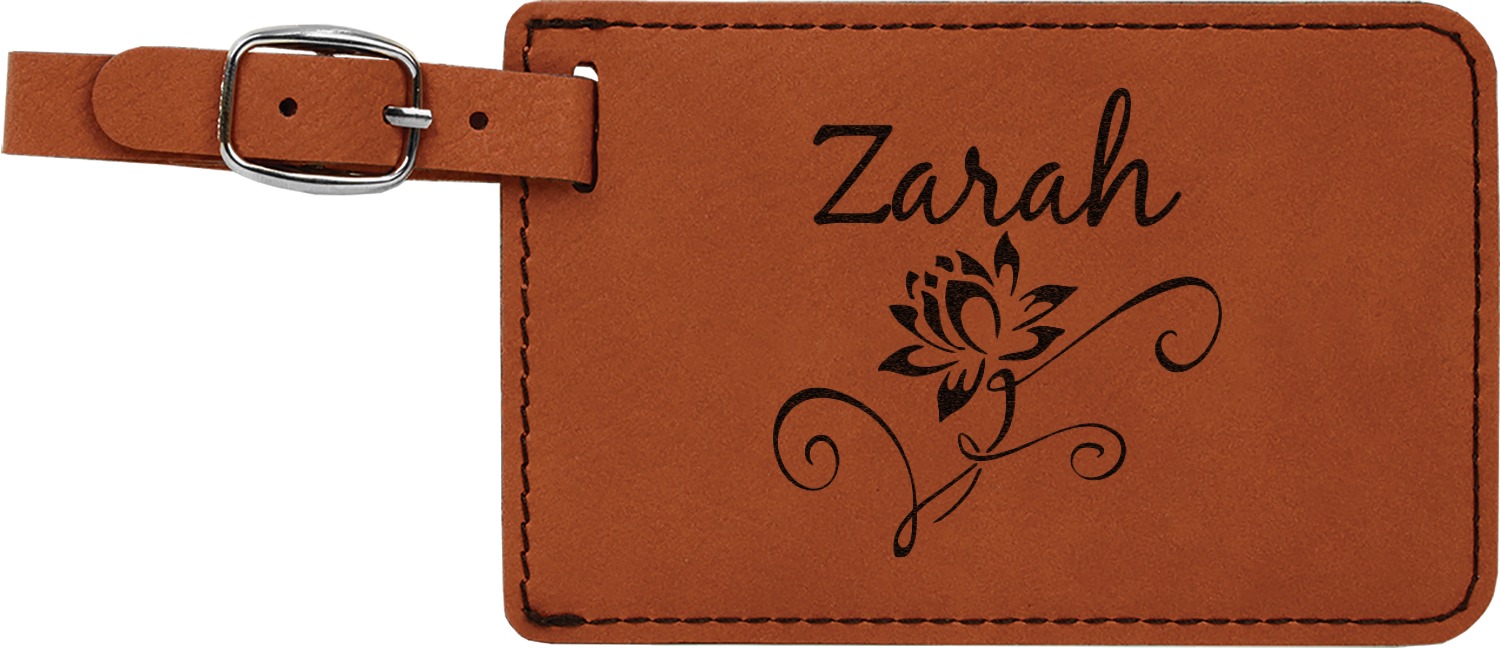 This luggage tag will surely be able to get you started in having all the right tools for traveling. It is made of a beautiful leatherette material that is a nice shade of cognac brown. The front of the tag is where your design goes. The sturdy black stitching gives your design an extra pop and gives the tag extra durability. The back of the tag has a clear vinyl window where you can slip in your address card. The tag comes with a great little buckle strap that you can easily use to clip to your suitcase. The tag itself measures at approximately 5.5"W x 4.25"H.
