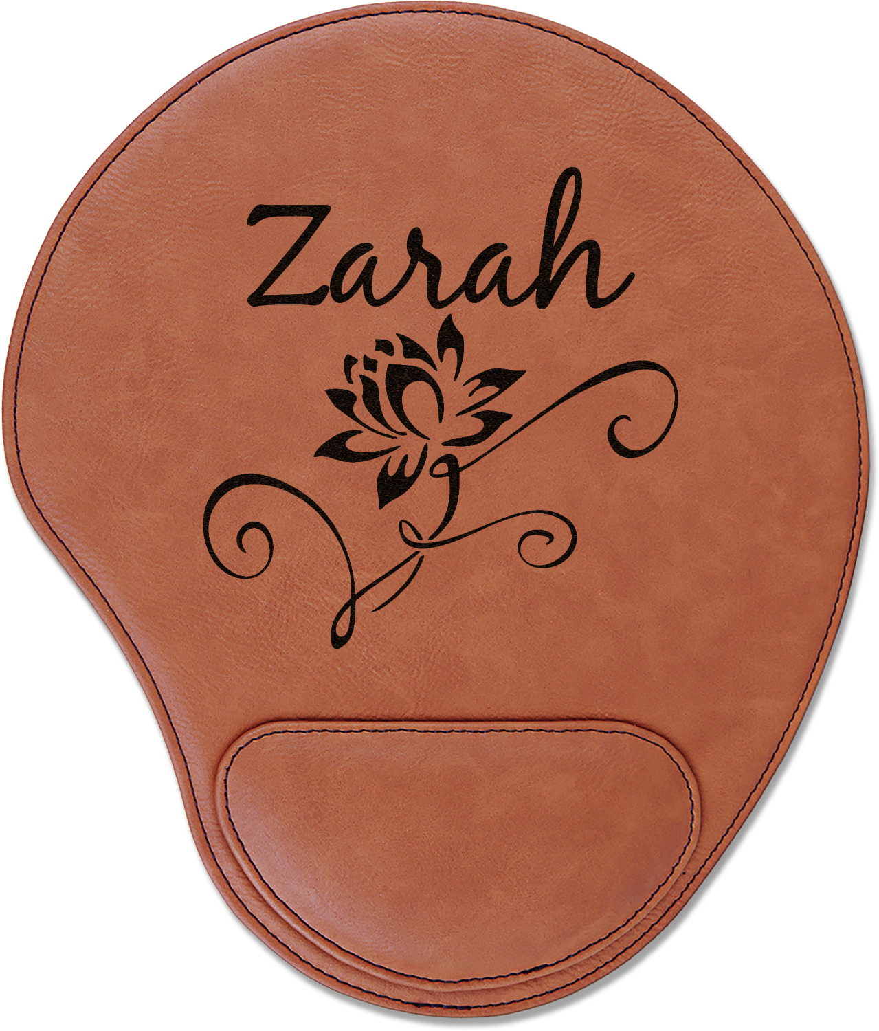 In a rounded shape, this mouse pad is made of a luxurious, cognac-colored leatherette. The nature of this material allows your mouse to glide smoothly across its surface. Strong stitching lines the edges to guarantee stability and strength. As added support for tired wrists, your personalized mouse pad features a supportive wrist rest at its bottom. This model measures at 10.25" x 9", while its wrist pad is approximately 5" x 2.75", with a thickness of 0.75". Your personalized design is laser engraved into the front face of this mouse pad.