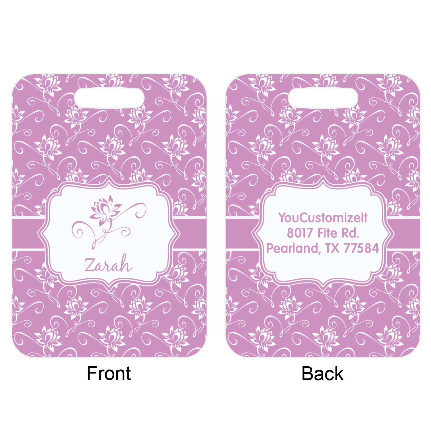 These metal luggage tags are printed on both sides; the front is printed with the design of your choice - and can be personalized with your name, name & initial or your monogram. The back can have as much or as little of your contact information as you desire - your name, your address, city, zip & state, you can also include your phone number and email address. Customize it exactly the way you want it!