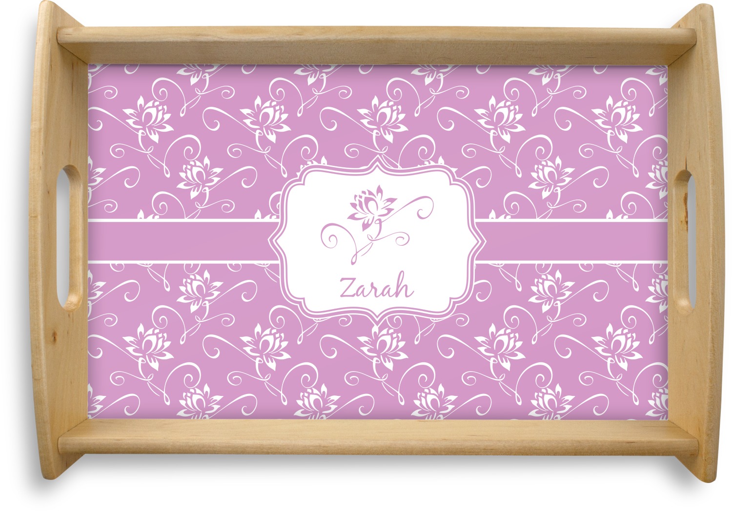This serving tray with handles features square edges and two rounded sides, creating a very modern look. Each side is fabricated from a beautifully cut, natural wood. The bottom of the interior of the tray displays your customized design in bright, vibrant color. The tray is sold in both a black color and a natural wood look. Each variation of the wood serving tray has two sizes: Small, which is 14" x 10" x 2.25", and Large, which is 19.5" x 13.5" x 2.75".