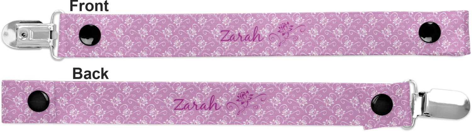 This personalized pacifier clip is the ideal size and measures at approximately 7.5 inches in length, when either end is snapped closed. On one end, you'll find a snap button. This button of your baby's pacifier holder is what can be attached to their pacifier to hold is securely in place. Simply open the snap, slip it through the pacifier opening, and snap it back into place. On the opposite end of this baby pacifier holder, you'll find a metal clip that can secure to a baby's collar or sleeve. This clip ensures that the strap stays in place, and that your baby's pacifier is always on hand.