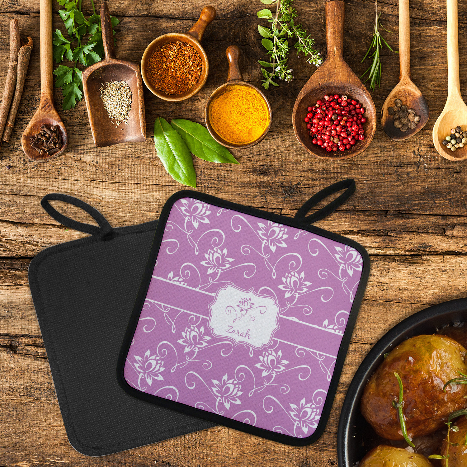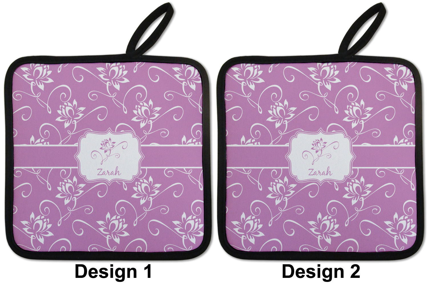 Our personalized pot holders feature a neoprene front that displays your personalization in vibrant colors. The backing of the hot pot holder is rubberized; the textured backing allows you to have a great grip when using this custom pot holder. The two materials are joined with a sleek, black trim, and the holder also includes an attached loop for hanging and storage. The pot holder is approximately 8.75 inches by 8.75 inches and 0.25 inches tall, while the fabric loop is 2.5 inches long. You can purchase a kitchen pot holder by itself or as a set of 2. We also offer a set including one pot holder and one oven mitt.