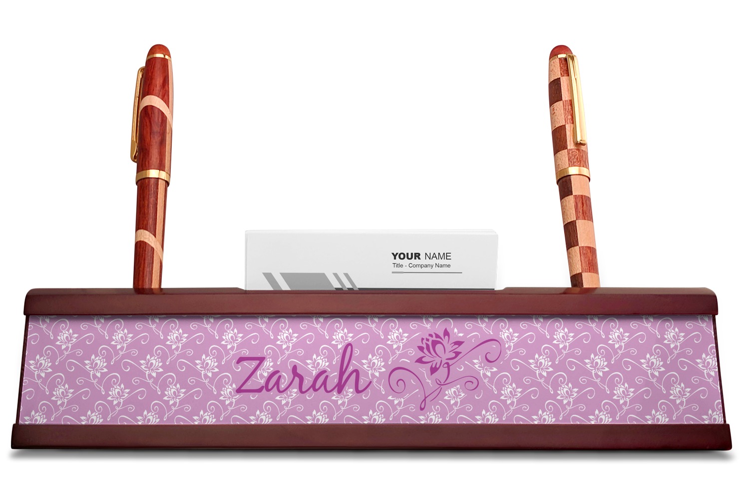 Your desk name plates are crafted from a high-quality, dark-cherry mahogany. At approximately 9.5 by 1.875 by 2.5 inches, this name plaque will fit perfectly, front and center, on your desk. Your customization spans across the entire face of the nameplate. Behind the nameplate lies a skinny slot that can fit approximately 15, traditionally-sized, business cards. You can also store your writing utensils on either side of this custom desk name plate.