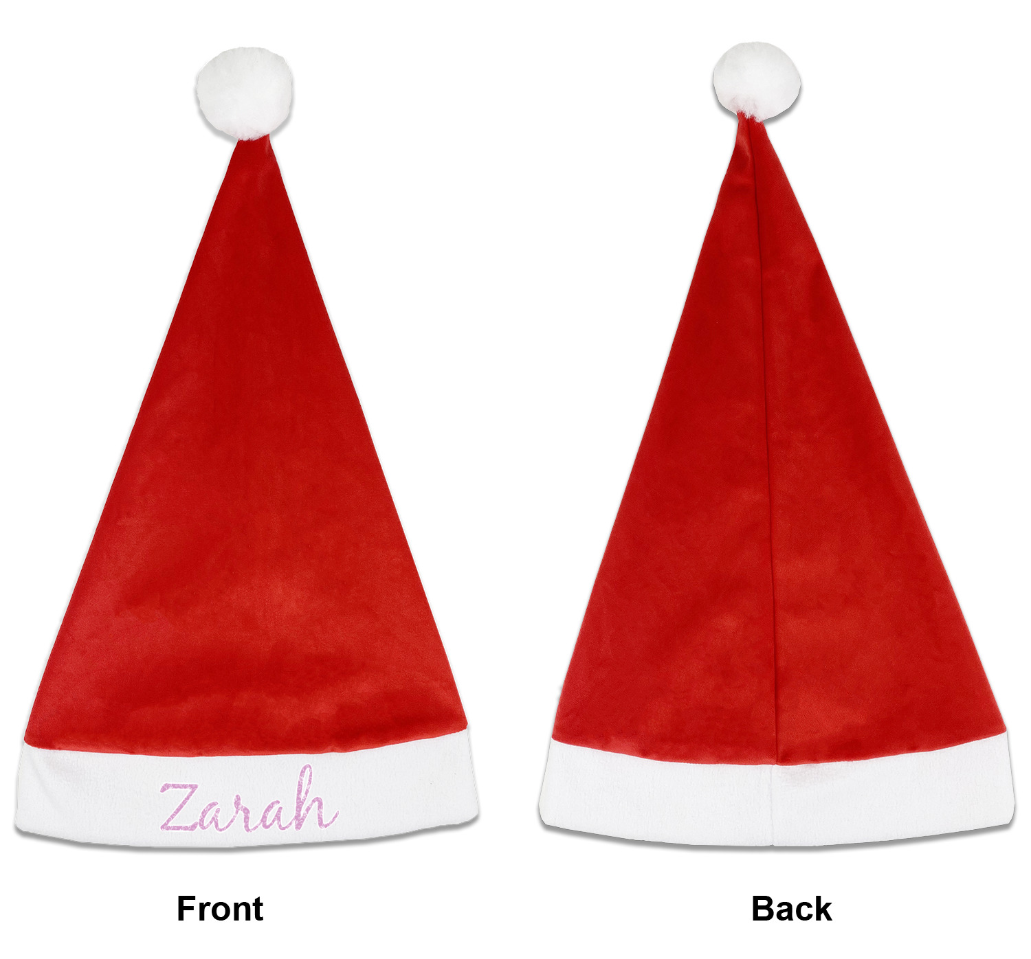 Our Santa hats are a soft, velvety polyester material. These customizable Santa hats are a classic red with white brimming and pom pom ball hanging off the hat tail just like Santa Claus! Each personalized Santa hat is approximately 17.5 L x 11.8 W. We offer two different styles to print your designs on the white brim - front or front & back.