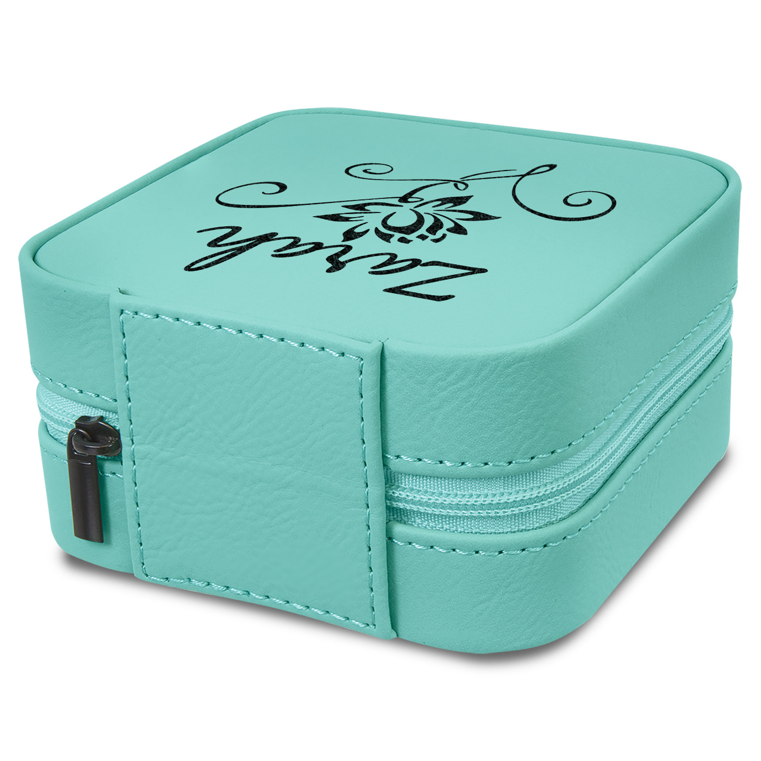 This square zippered travel jewelry box is made from leatherette and is available in four colors - classic cognac / rawhide, a beautiful teal. navy blue or pink. The tan colored soft velvet inside has compartments and hooks for all your jewelry - rings, chains, earrings, bangles etc.