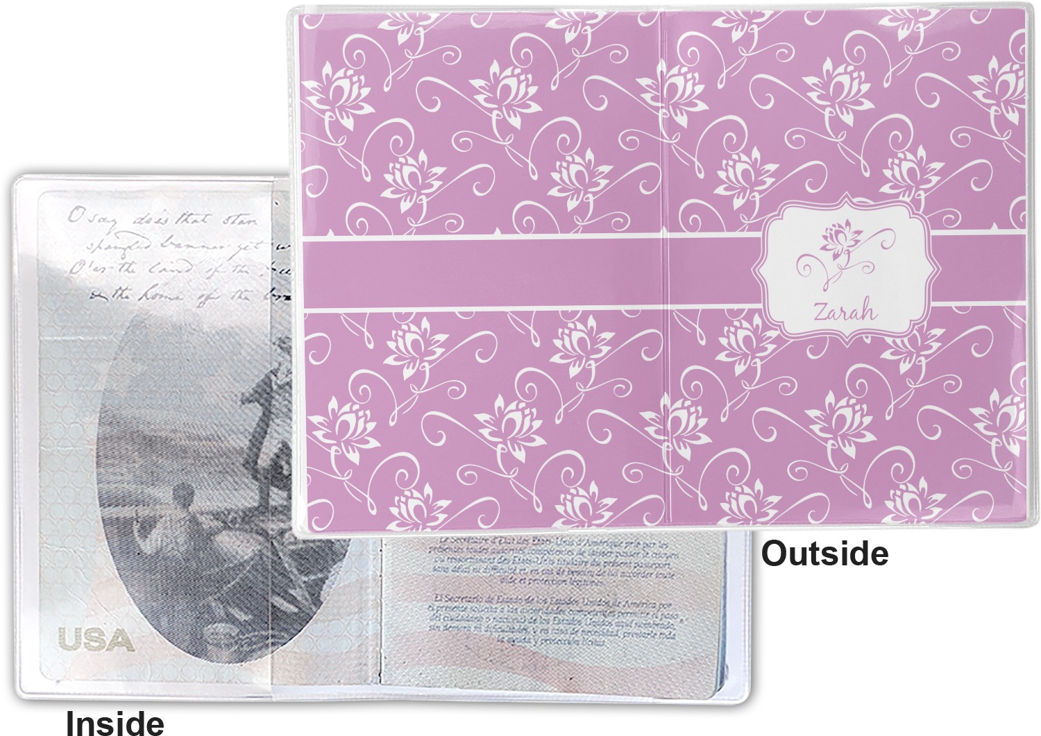 This cover is made of a sturdy clear vinyl with a personalized vinyl insert inside. There is a large and a small pocket on either side to hold the covers of your passport easily and firmly. The passport holder is approximately 7.5" x 5.25", the perfect size to snugly fit your passport. This slim cover is the perfect way to protect your passport without being one more bulky item you have to carry.