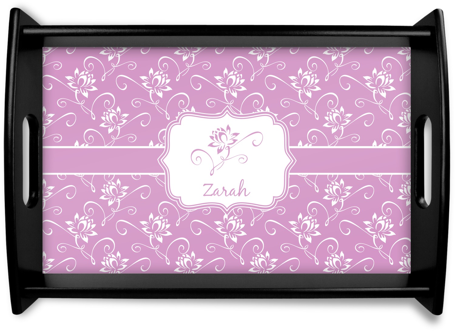 This serving tray with handles features square edges and two rounded sides, creating a very modern look. Each side is fabricated from a beautifully cut, natural wood. The bottom of the interior of the tray displays your customized design in bright, vibrant color. The tray is sold in both a black color and a natural wood look. Each variation of the wood serving tray has two sizes: Small, which is 14" x 10" x 2.25", and Large, which is 19.5" x 13.5" x 2.75".