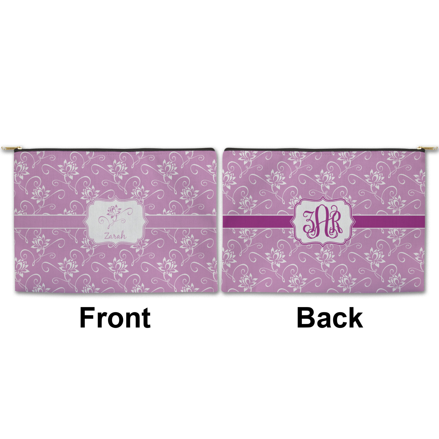 You can design both the front and the back of the pouch - same design, two complementary designs or two totally different designs - the choice is yours! We offer many different personalization styles i.e. name, name & initial, monograms - so the choice to personalize is also yours.