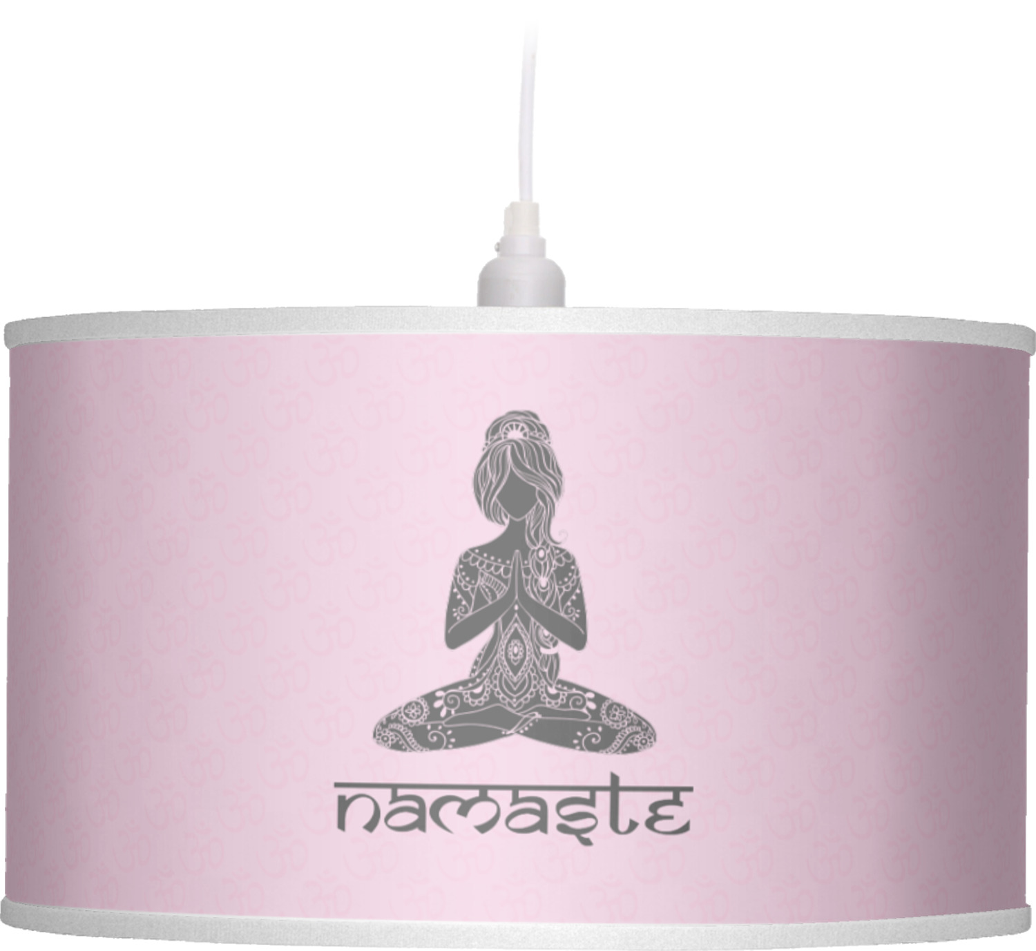 This design is customizable. We chose to use the om background with two shades of pink. We have other yoga backgrounds that you can choose from. We chose the large graphic and text style, where the graphic is of a beautiful woman sitting in lotus pose with prayer hands in pink and dark grey. We have many different yoga graphics that you can choose from including the tree pose and meditation pose. We chose to use the word Namaste in the Sanskrit font. You can choose the personalization, the font and the colors.
