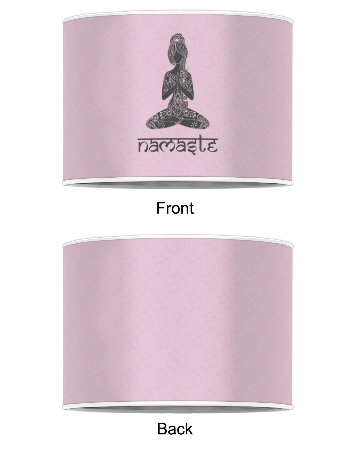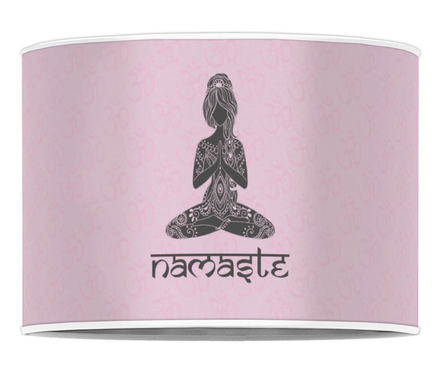 This design is customizable. We chose to use the om background with two shades of pink. We have other yoga backgrounds that you can choose from. We chose the large graphic and text style, where the graphic is of a beautiful woman sitting in lotus pose with prayer hands in pink and dark grey. We have many different yoga graphics that you can choose from including the tree pose and meditation pose. We chose to use the word Namaste in the Sanskrit font. You can choose the personalization, the font and the colors.