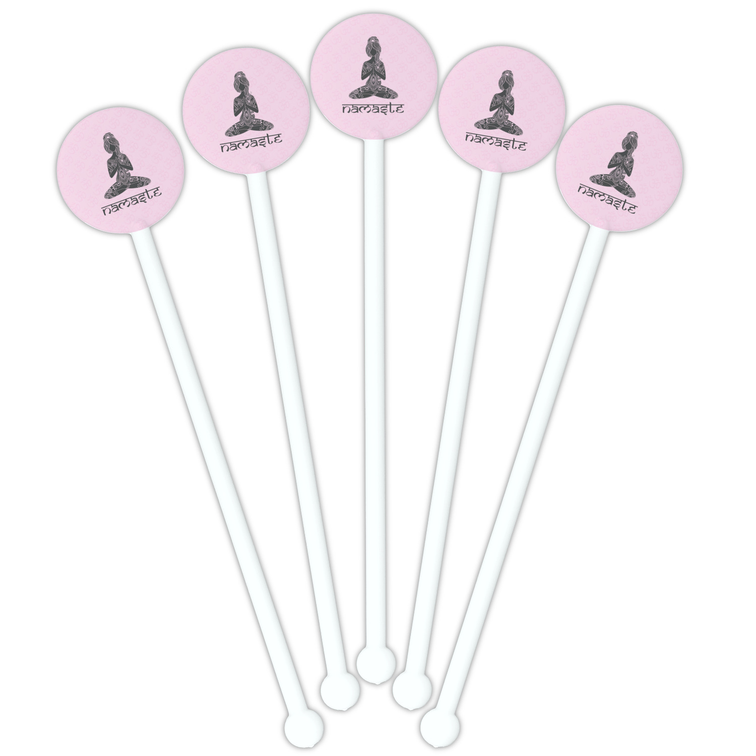This design is customizable. We chose to use the om background with two shades of pink. We have other yoga backgrounds that you can choose from. We chose the large graphic and text style, where the graphic is of a beautiful woman sitting in lotus pose with prayer hands in pink and dark grey. We have many different yoga graphics that you can choose from including the tree pose and meditation pose. We chose to use the word Namaste in the Sanskrit font. You can choose the personalization, the font and the colors.
