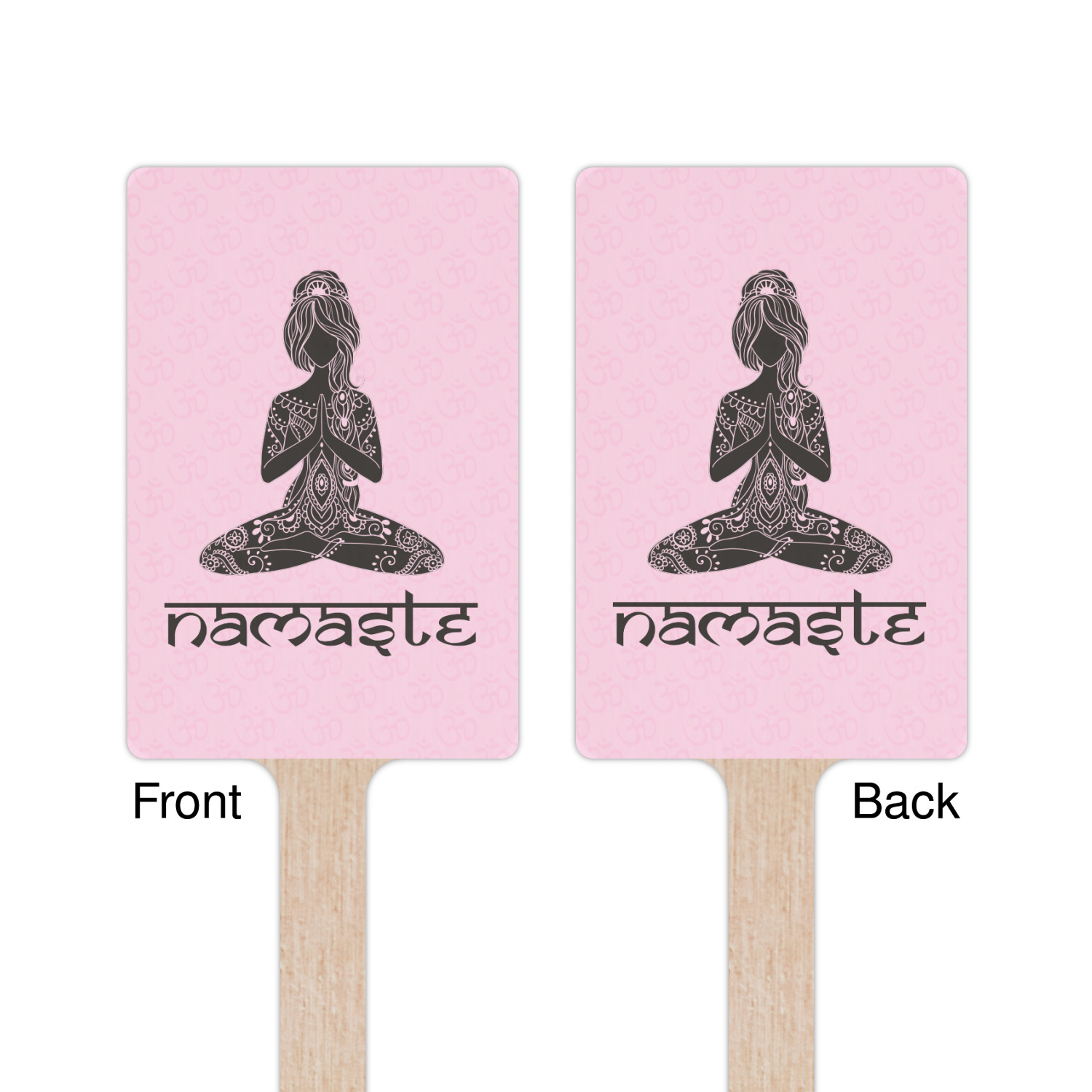 This design is customizable. We chose to use the om background with two shades of pink. We have other yoga backgrounds that you can choose from. We chose the large graphic and text style, where the graphic is of a beautiful woman sitting in lotus pose with prayer hands in pink and dark grey. We have many different yoga graphics that you can choose from including the tree pose and meditation pose. We chose to use the word Namaste in the Sanskrit font. You can choose the personalization, the font and the colors.