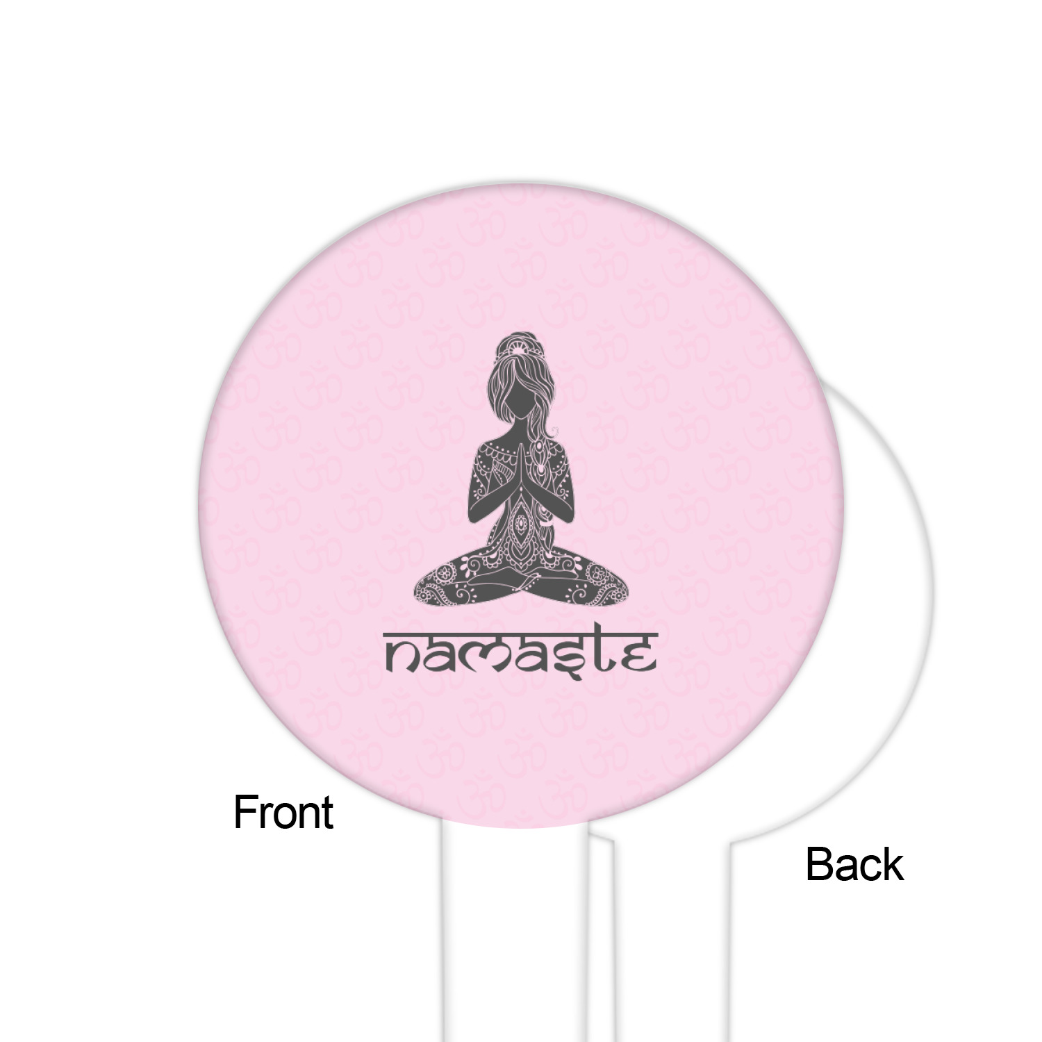 This design is customizable. We chose to use the om background with two shades of pink. We have other yoga backgrounds that you can choose from. We chose the large graphic and text style, where the graphic is of a beautiful woman sitting in lotus pose with prayer hands in pink and dark grey. We have many different yoga graphics that you can choose from including the tree pose and meditation pose. We chose to use the word Namaste in the Sanskrit font. You can choose the personalization, the font and the colors.